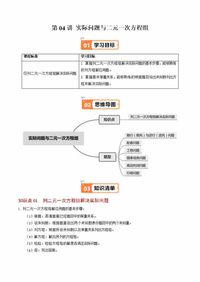 第04讲 实际问题与二元一次方程组(1个知识点6类热点题型讲练习题巩固)(学生版)