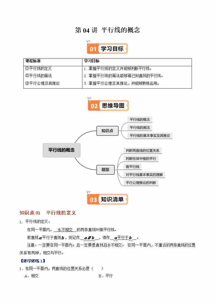 第04讲 平行线的概念(3个知识点5类热点题型讲练习题巩固)(教师版)