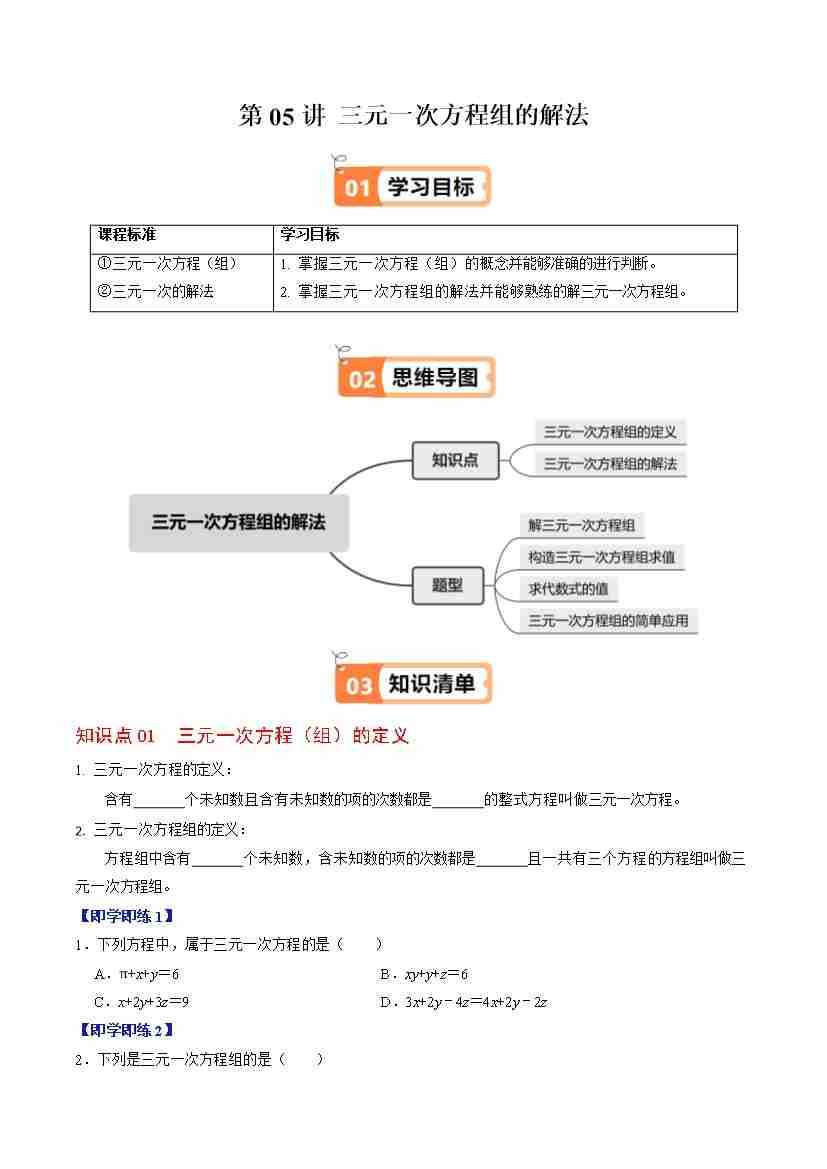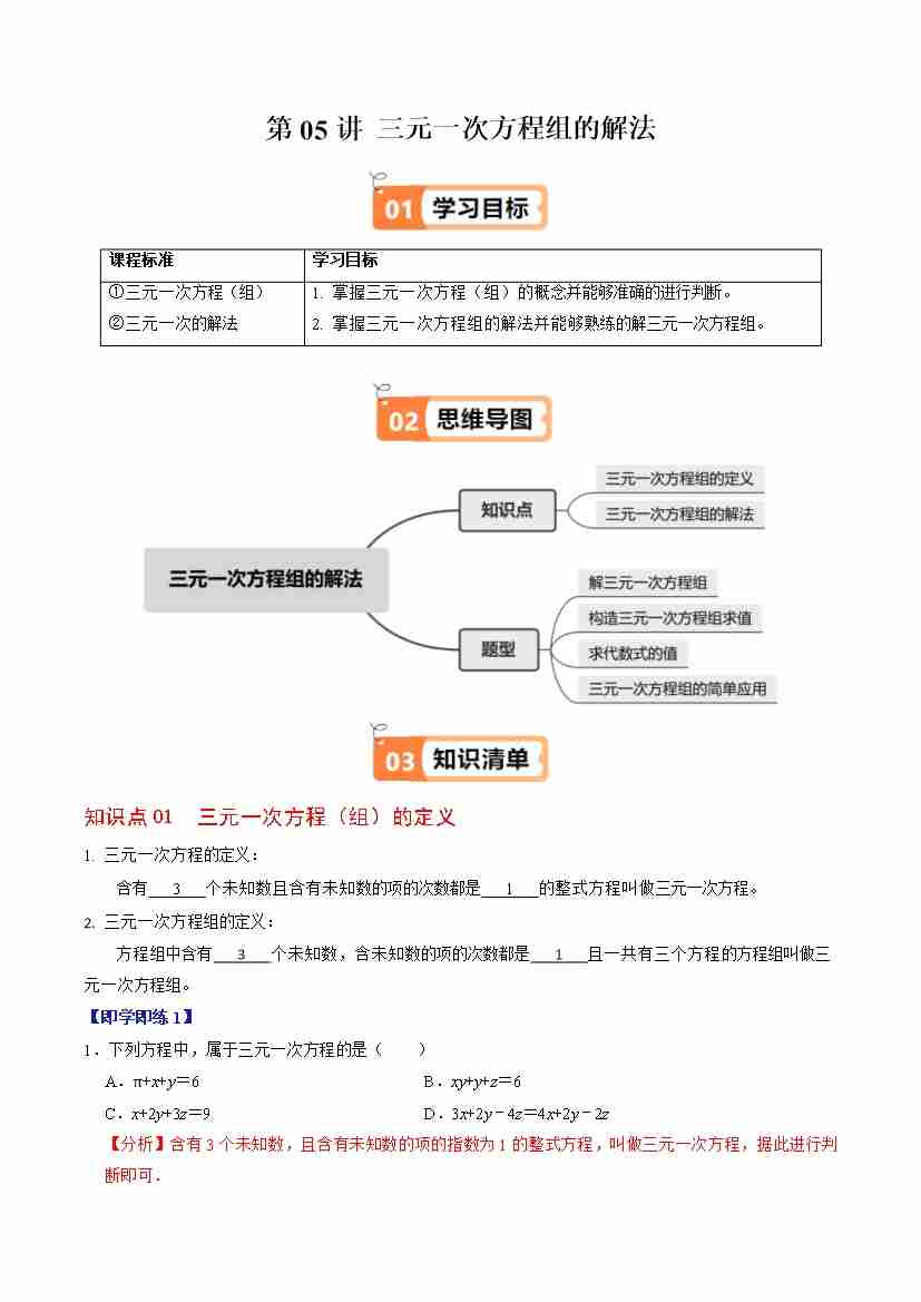 第05讲 三元一次方程组的解法(2个知识点4类热点题型讲练习题巩固)(学生版)