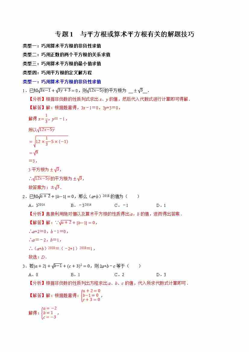 专题1 与平方根或算术平方根有关的四种解题技巧(教师版)
