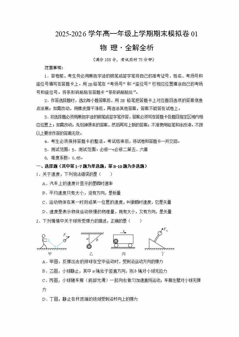 高一物理上学期期末模拟卷01(人教版,必修一、必修二第五、六章)(原卷版)