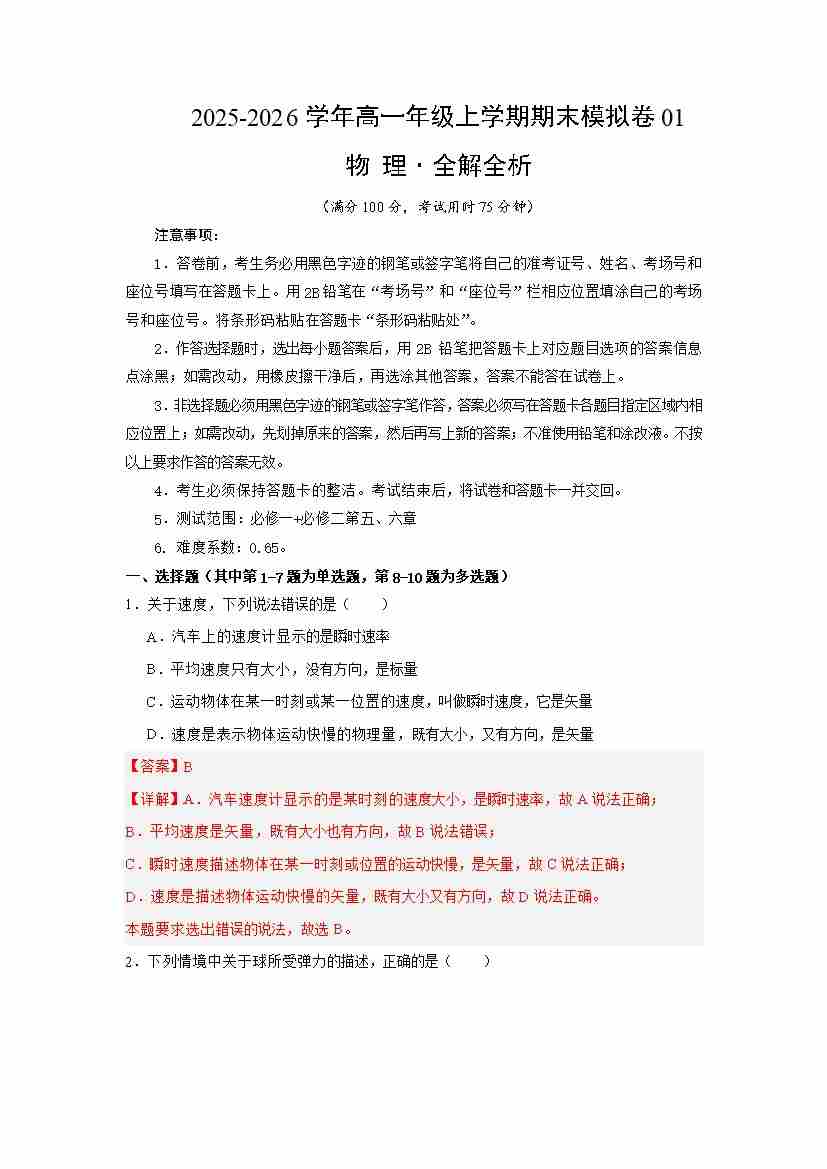 高一物理上学期期末模拟卷01(人教版,必修一、必修二第五、六章)(解析版)