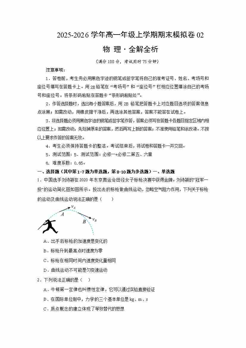 高一物理上学期期末模拟卷02(人教版,必修一、必修二第五、六章)(原卷版)