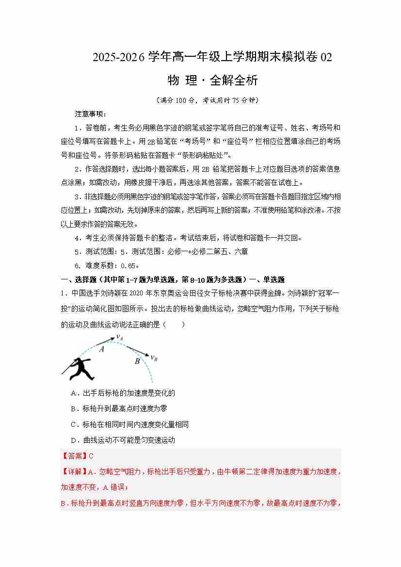高一物理上学期期末模拟卷02(人教版,必修一、必修二第五、六章)(解析版)