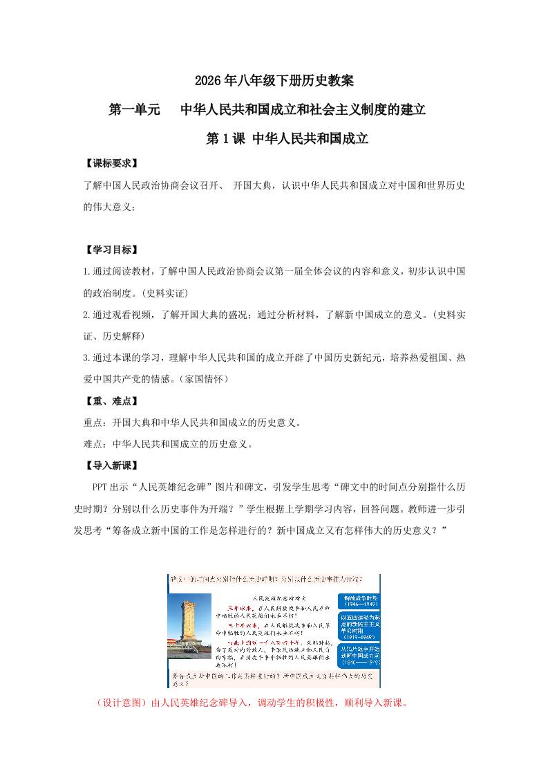 1.1 中华人民共和国成立 教学设计 2025-2026学年统编版八年级历史下学期