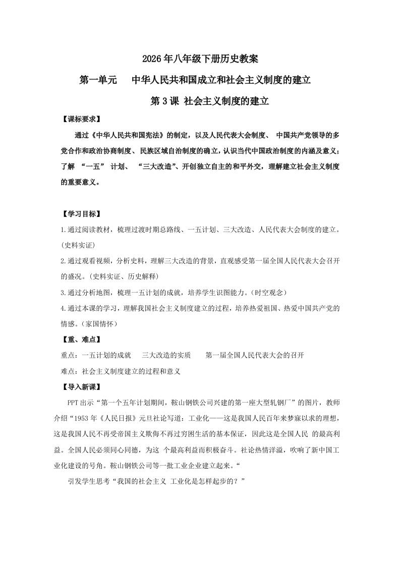 1.3 社会主义制度的建立 教学设计 2025-2026学年统编版八年级历史下学期