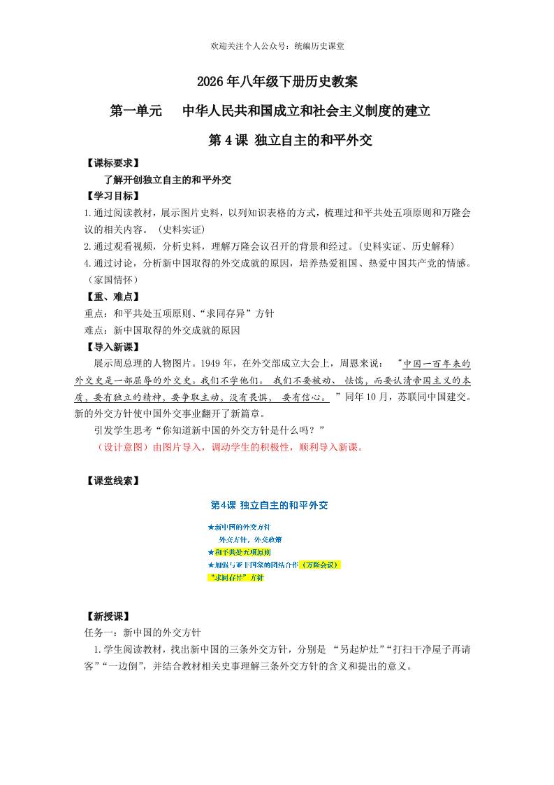 1.4 独立自主的和平外交 教学设计 2025-2026学年统编版八年级历史下学期