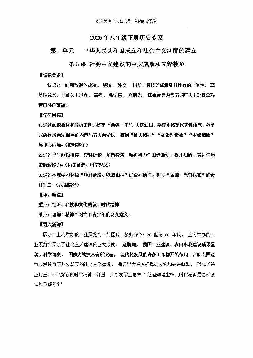 2.6 社会主义建设的巨大成就和先锋模范 教学设计 2025-2026学年统编版八年级历史下册