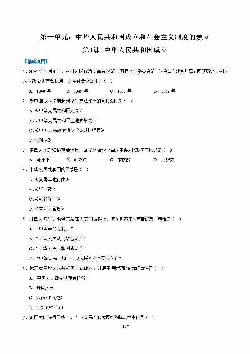 第1课 中华人民共和国成立(任务型分层作业)(原卷版)