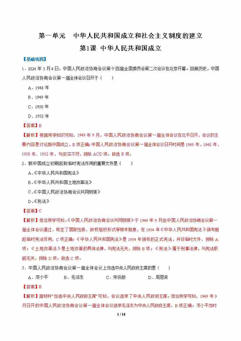 第1课 中华人民共和国成立(任务型分层作业)(解析版)