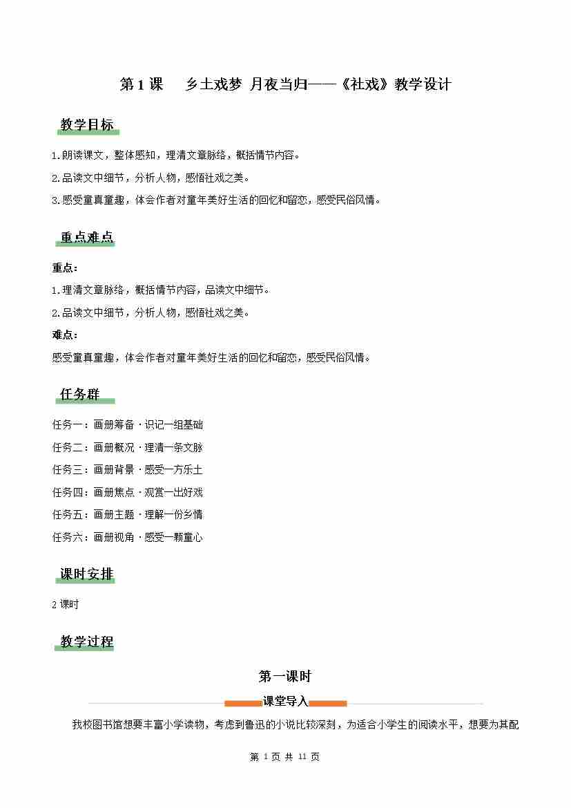 1 社戏:乡土戏梦 月夜当归(情境任务教学设计)语文统编版2024八年级下册