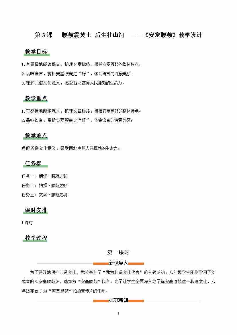 3 安塞腰鼓:腰鼓震黄土 后生壮山河(情境任务教学设计)语文新教材统编版八年级下册