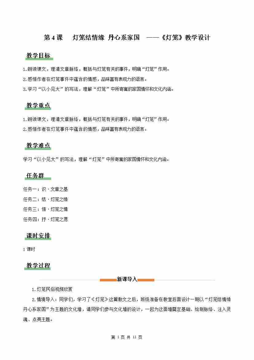 4 灯笼:灯笼结情缘 丹心系家国(情境任务教学设计)语文新教材统编版八年级下册