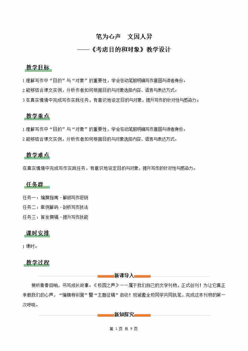 写作:考虑目的和对象:笔为心声 文因人定(情境任务教学设计)语文新教材统编版八年级下册