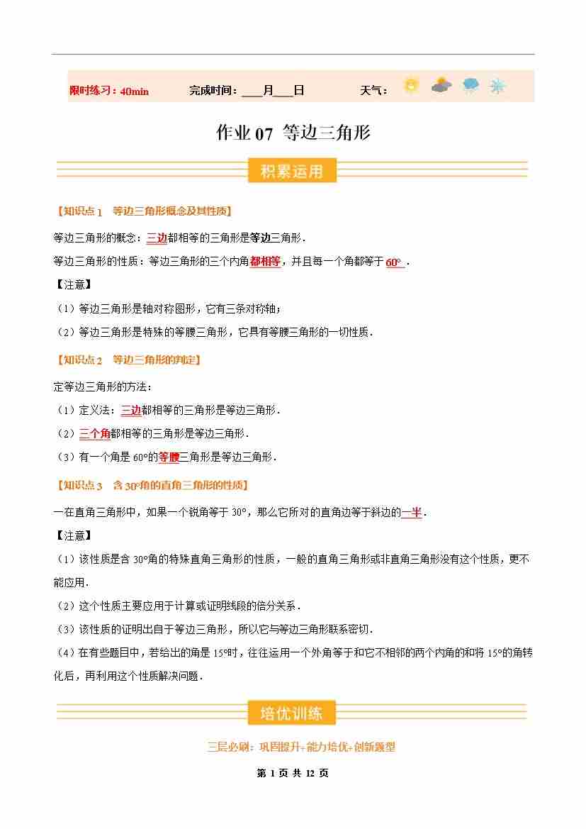 ③寒假培优练-专题07 等边三角形(巩固培优)(学生版)-2026年八年级数学寒假衔接讲练 (人教版-新教材)