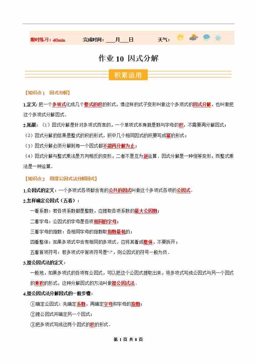 ③寒假培优练-专题10 因式分解(巩固培优)八年级数学新教材人教版(学生版)-2026年八年级数学寒假衔接讲练 (人教版-新教材)