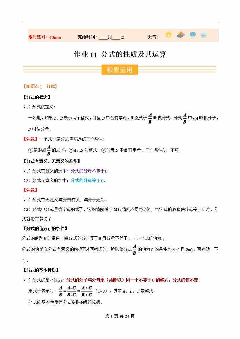 ③寒假培优练-专题11 分式的性质及其运算(巩固培优)八年级数学新教材人教版(学生版)-2026年八年级数学寒假衔接讲练 (人教版-新教材)