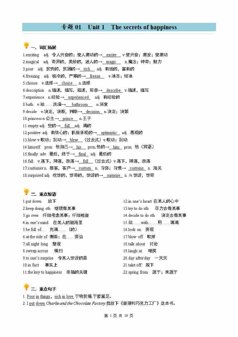 专题01 Unit1 The secrets of happiness同步讲义(教师版)