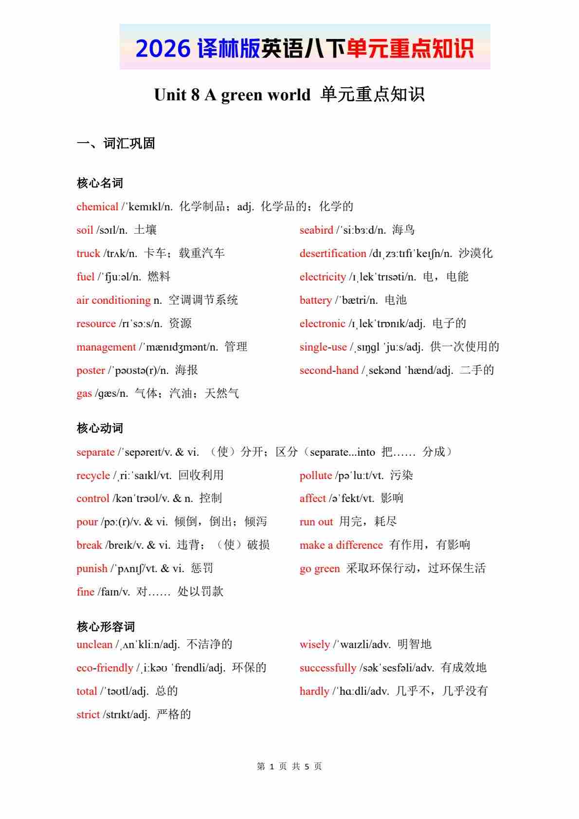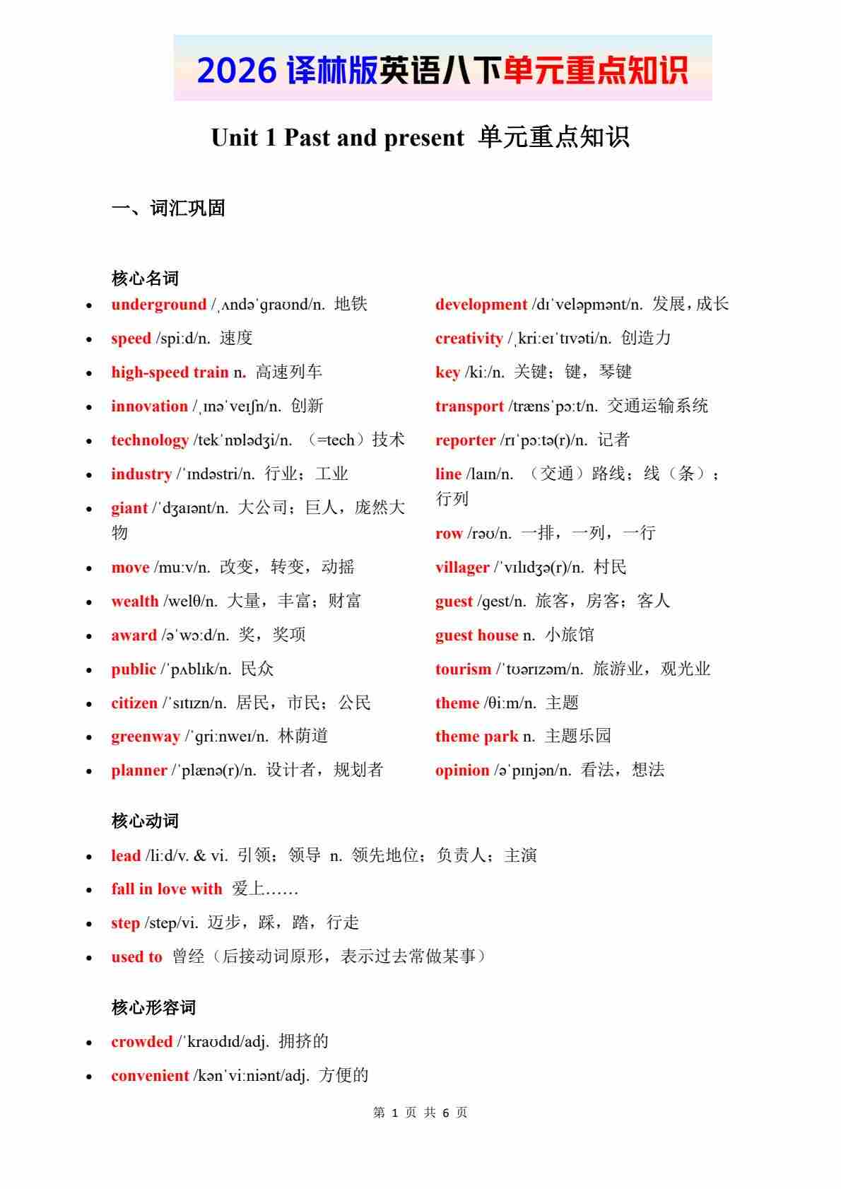 Unit 1 Past and present 单元核心知识(背诵默写任务单)(背诵版)