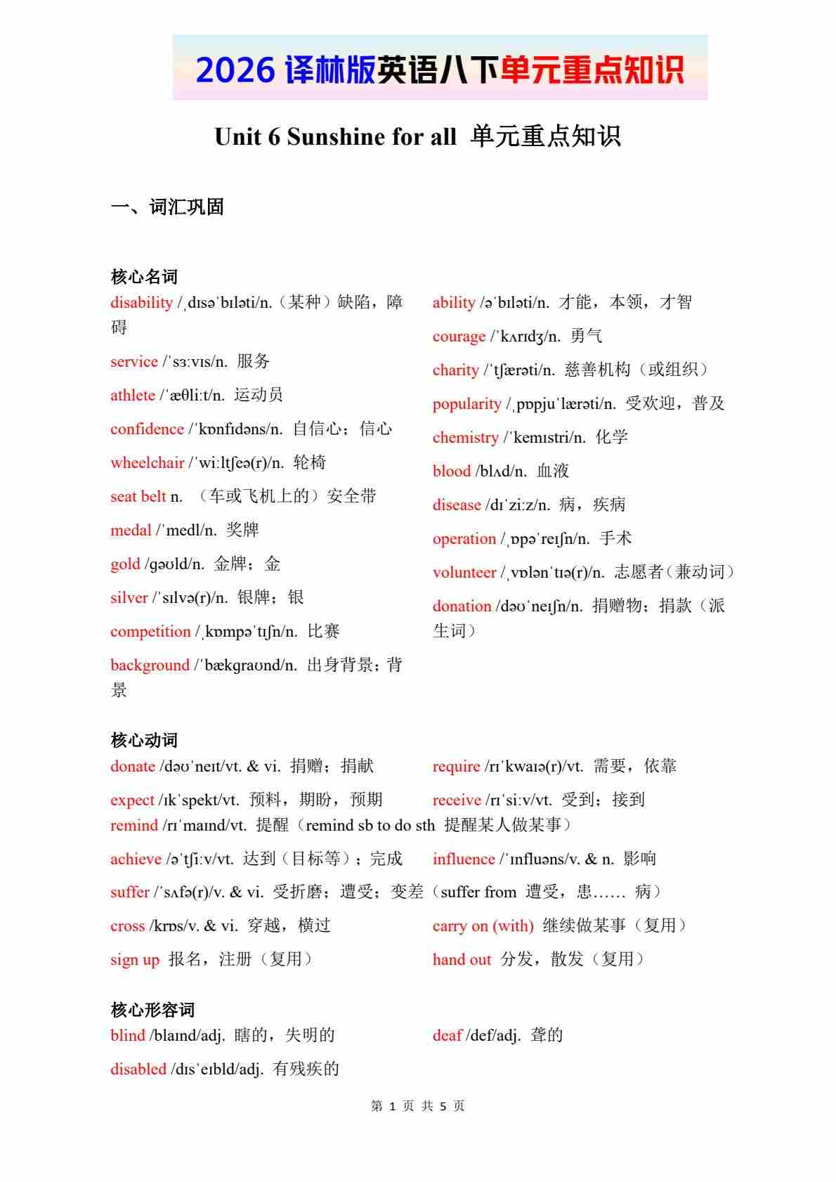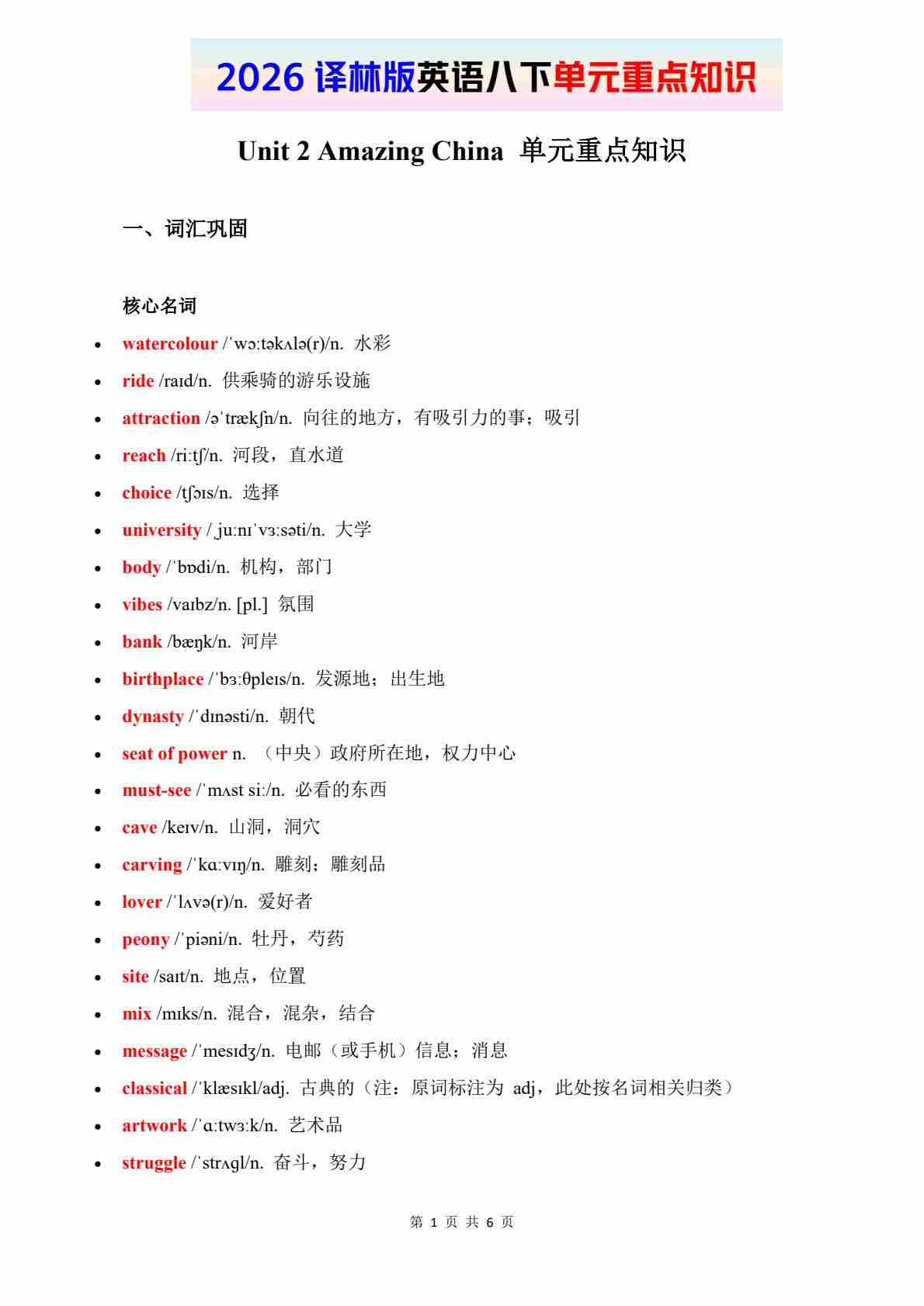 Unit 2 Amazing China单元核心知识(背诵默写任务单)(背诵版)
