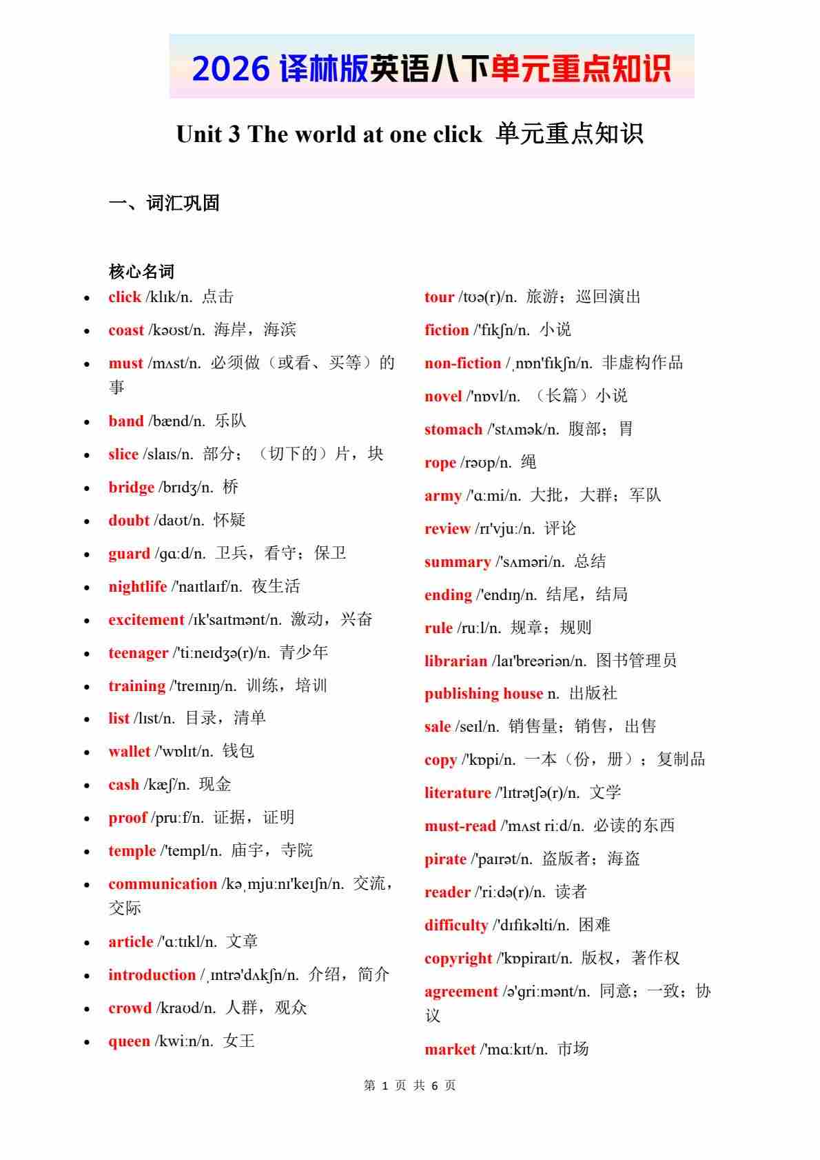 Unit 3 The world at one click单元核心知识(背诵默写任务单)(背诵版)