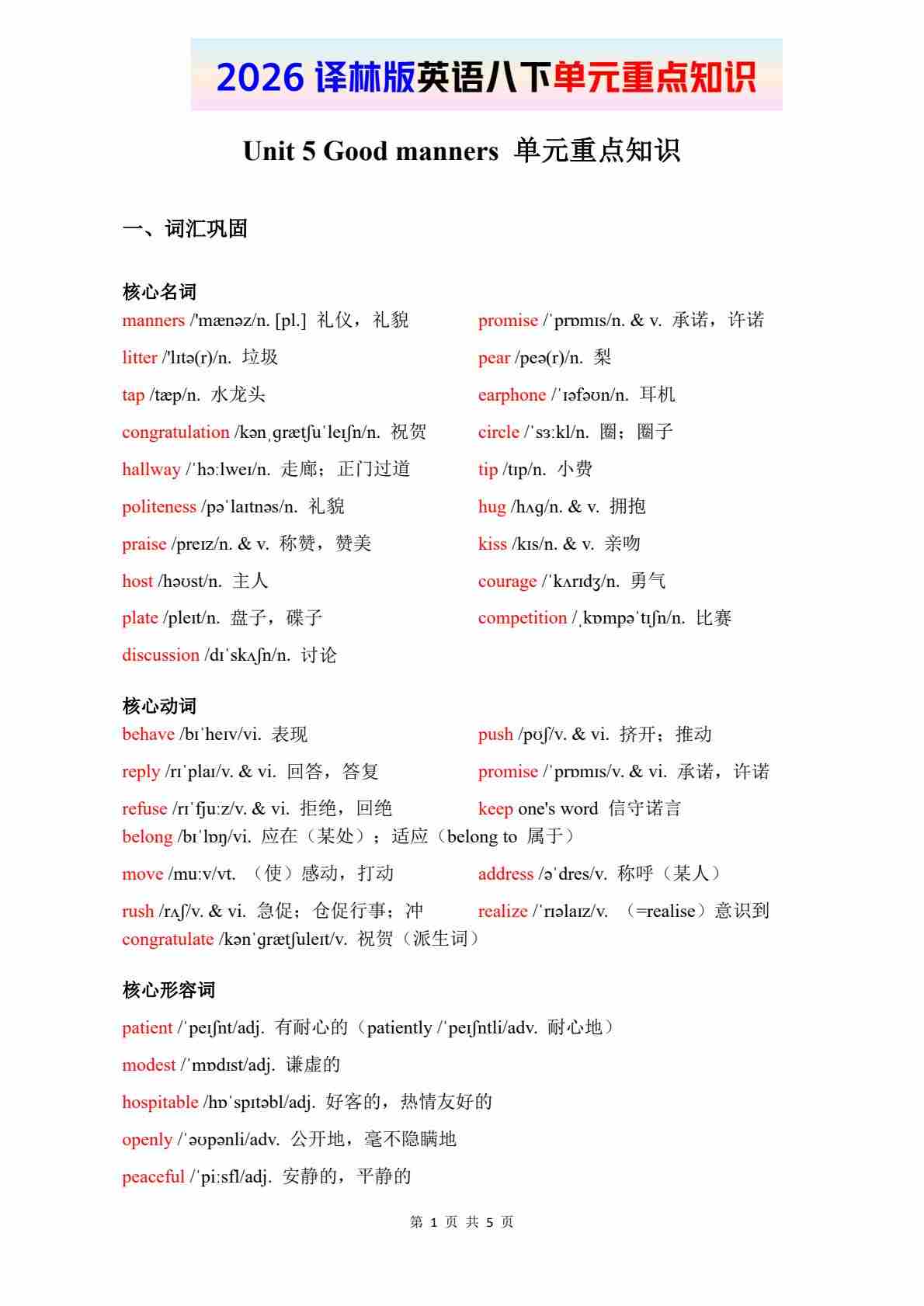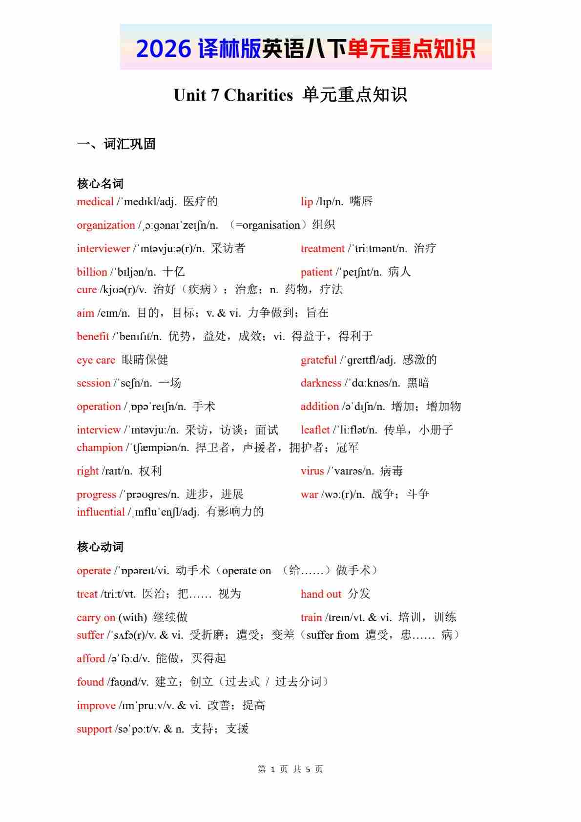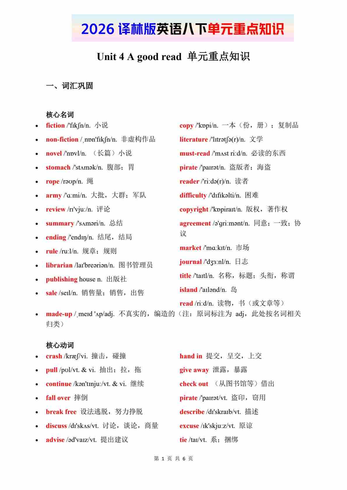 Unit 4 A good read 单元核心知识(背诵默写任务单)(背诵版)