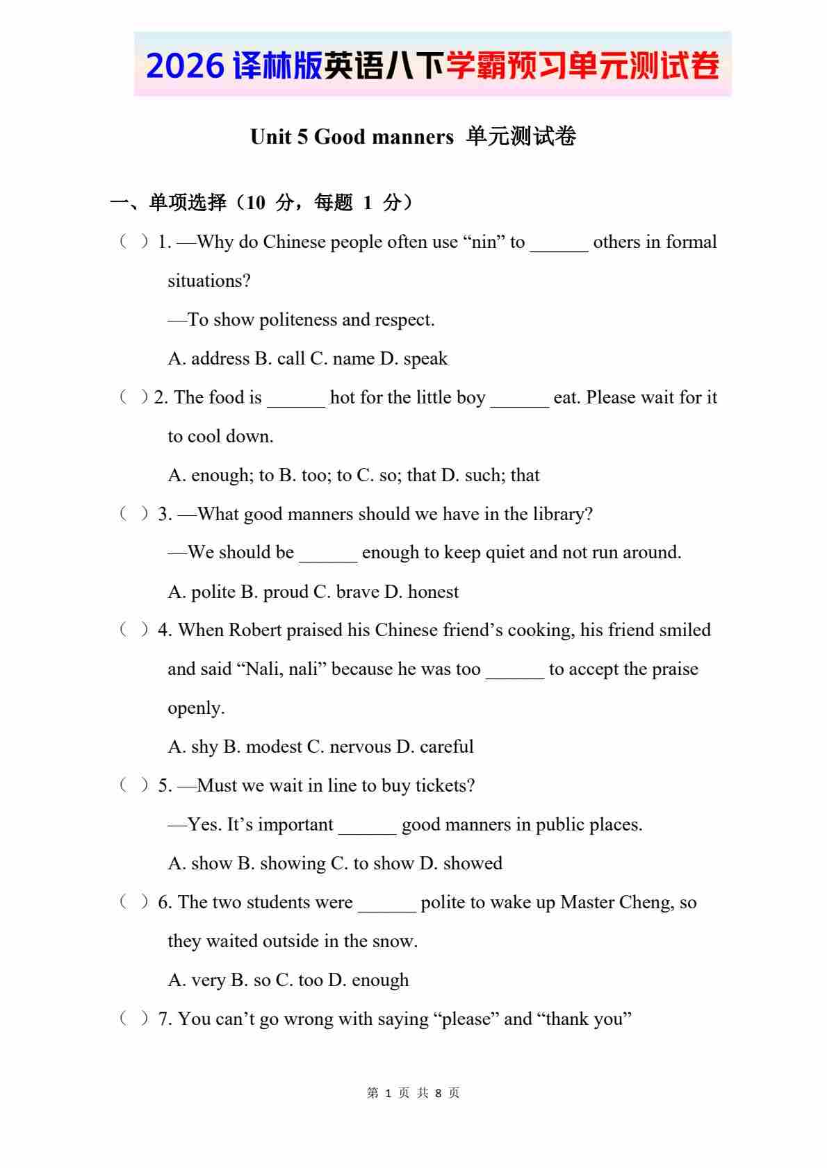 Unit5 Good manners单元模拟卷-2025-2026学年译林版英语八年级下册