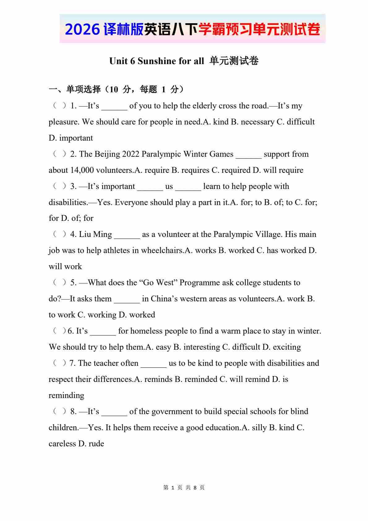 Unit6 Sunshine for all单元模拟卷-2025-2026学年译林版英语八年级下册