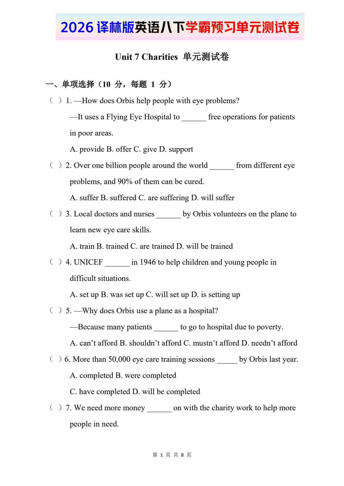 Unit7 Charities单元模拟卷-2025-2026学年译林版英语八年级下册