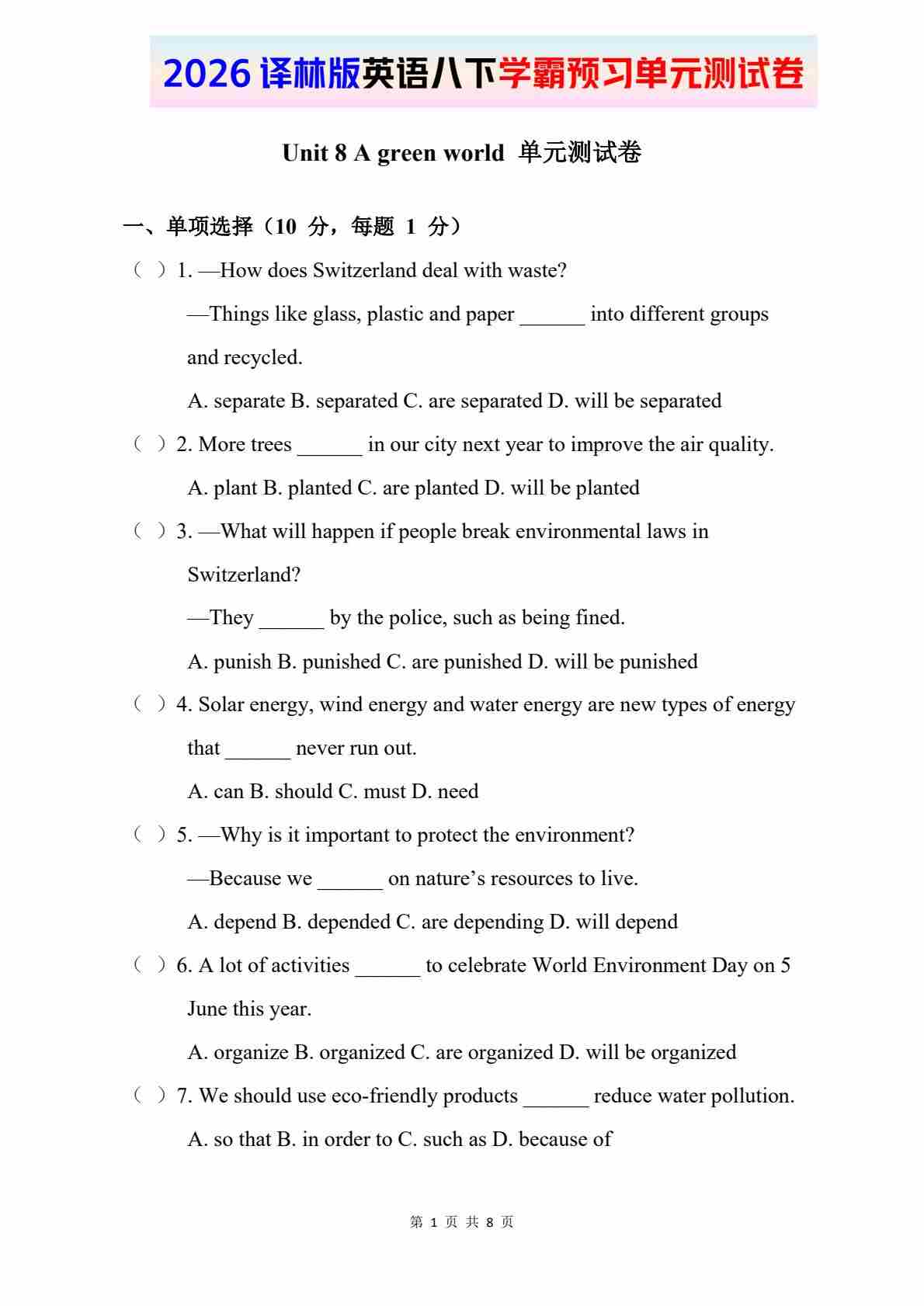 Unit8 A green world单元模拟卷-2025-2026学年译林版英语八年级下册