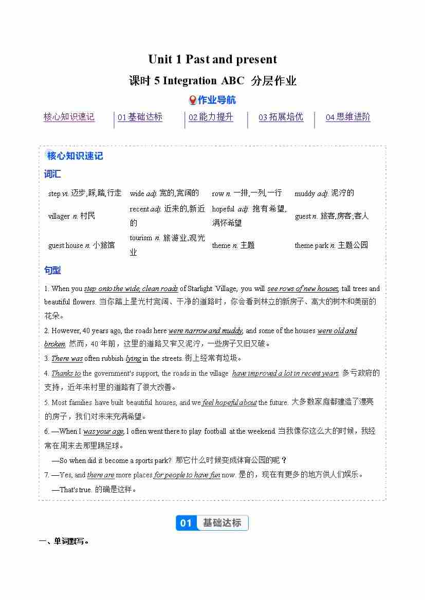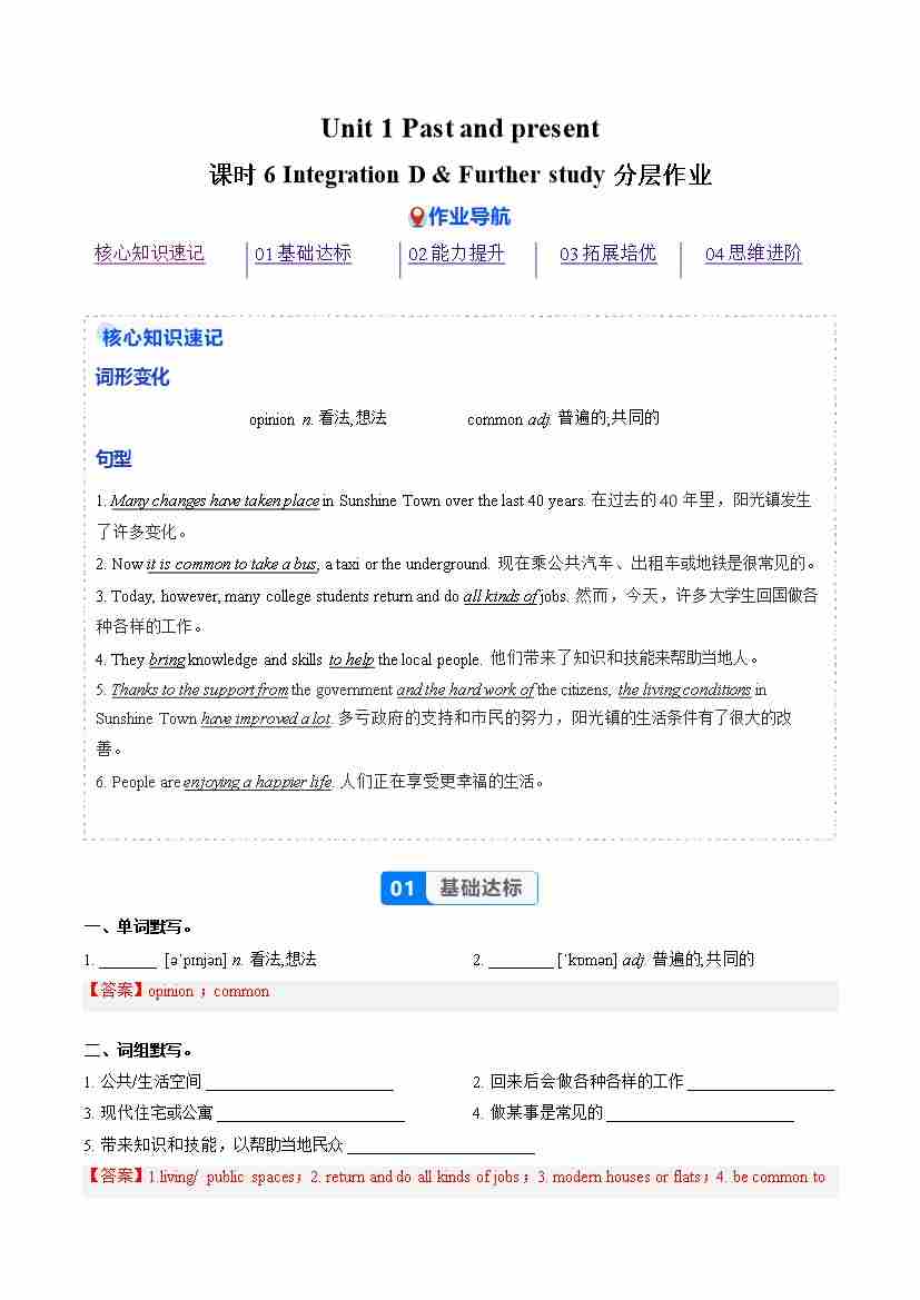 Unit 1 课时6 Integration D & Further study(分层作业)(解析版)