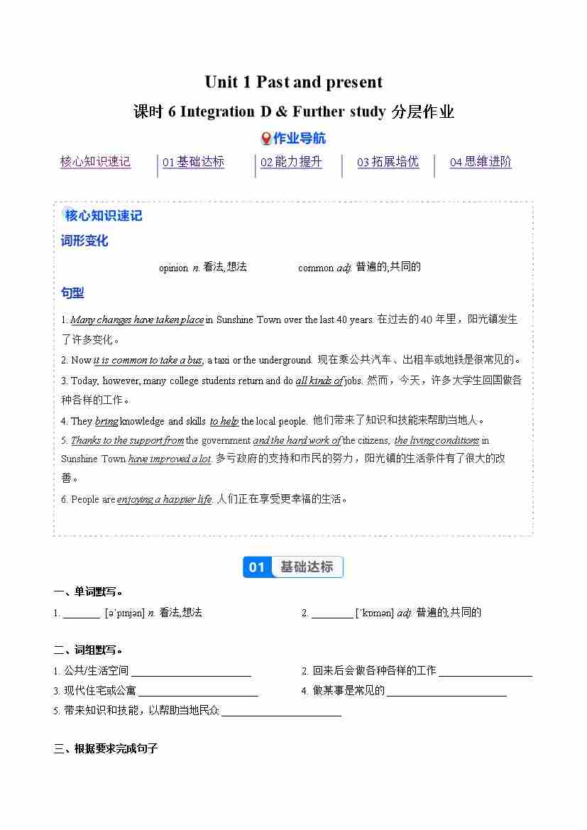 Unit 1 课时6 Integration D & Further study(分层作业)(原卷版)