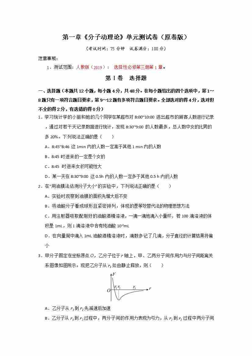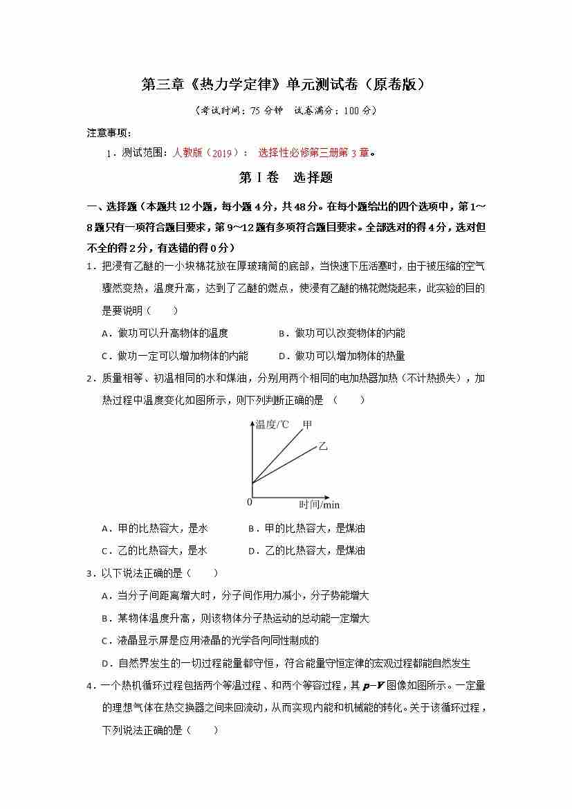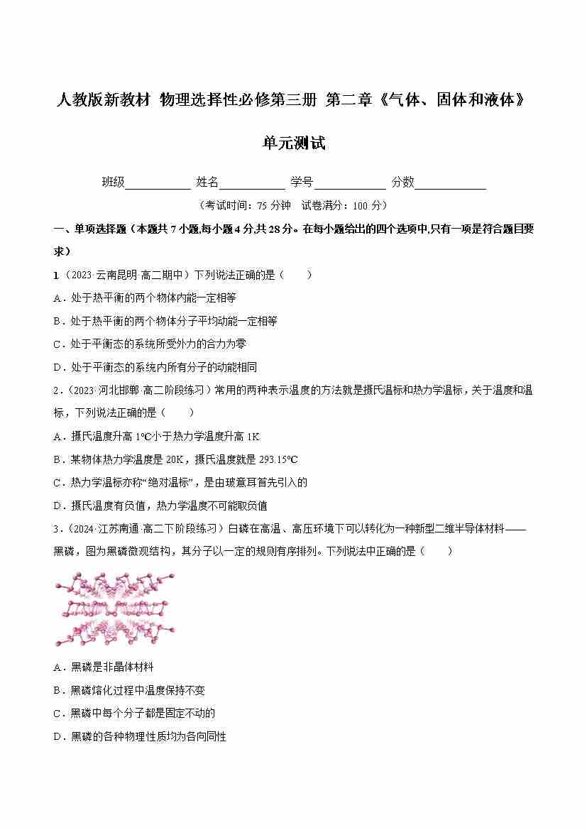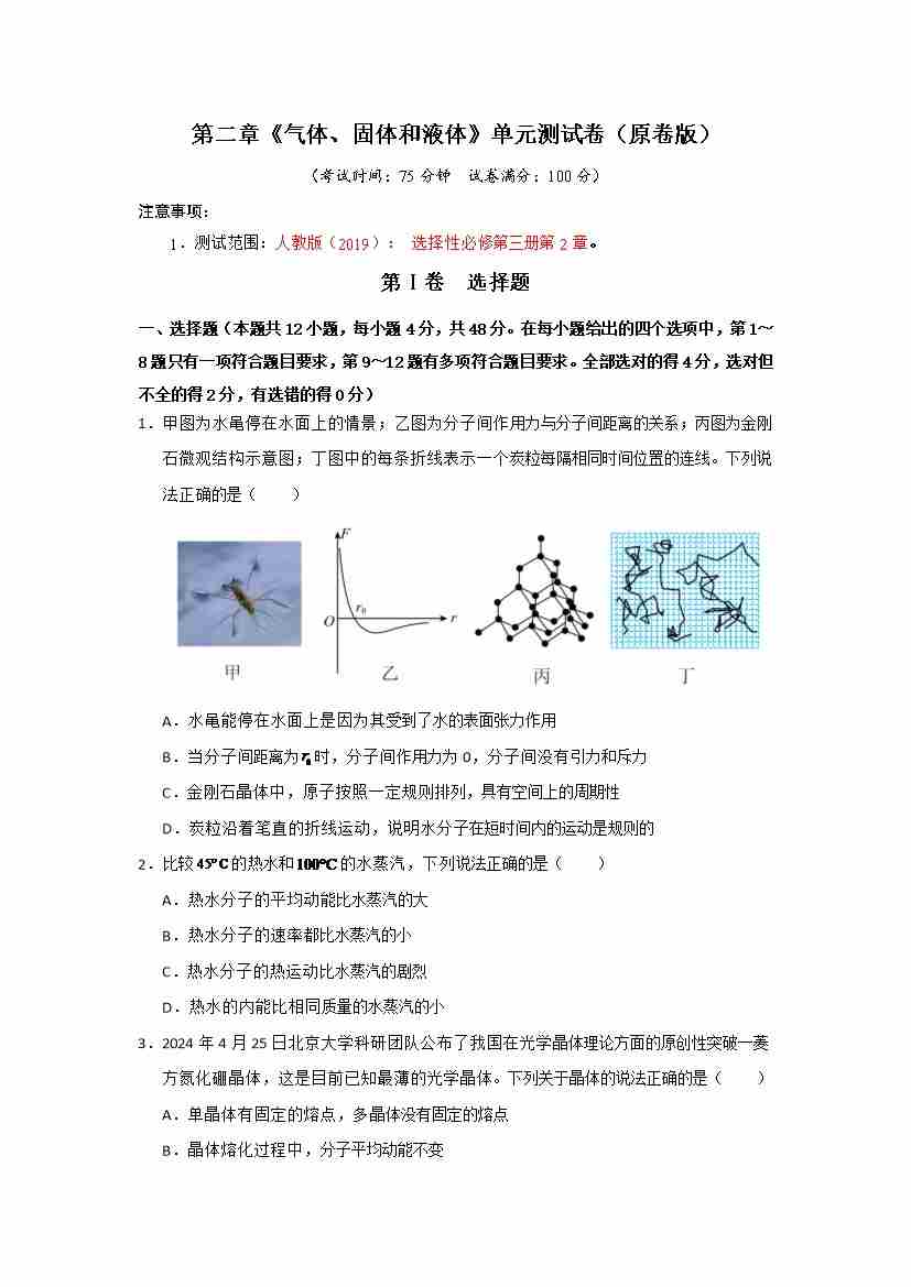 第二章 气体、固体和液体(单元测试)(原卷版)