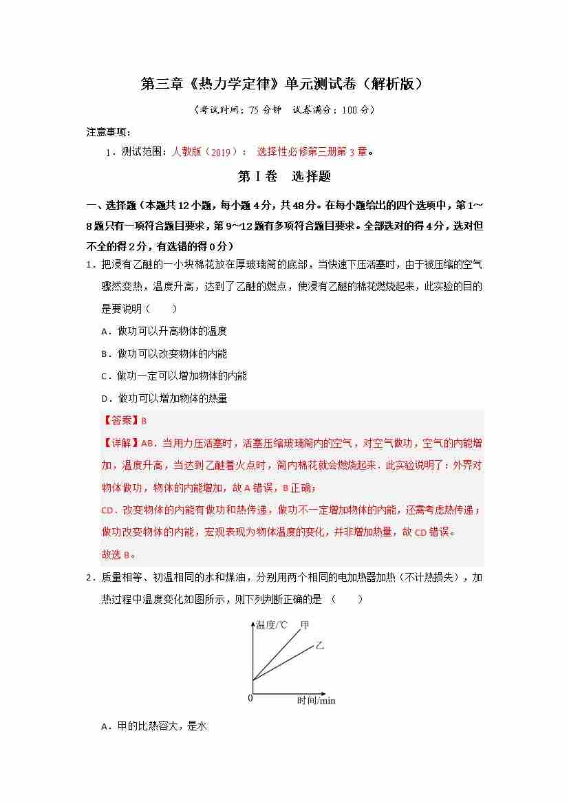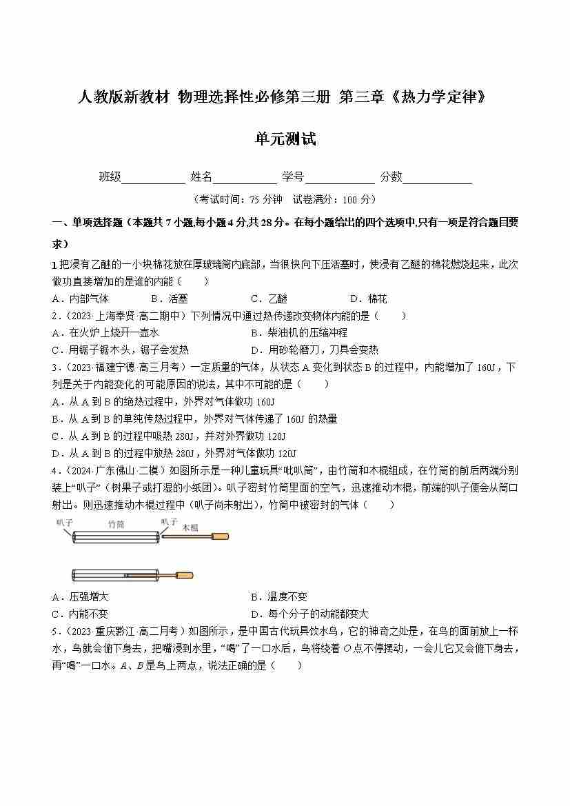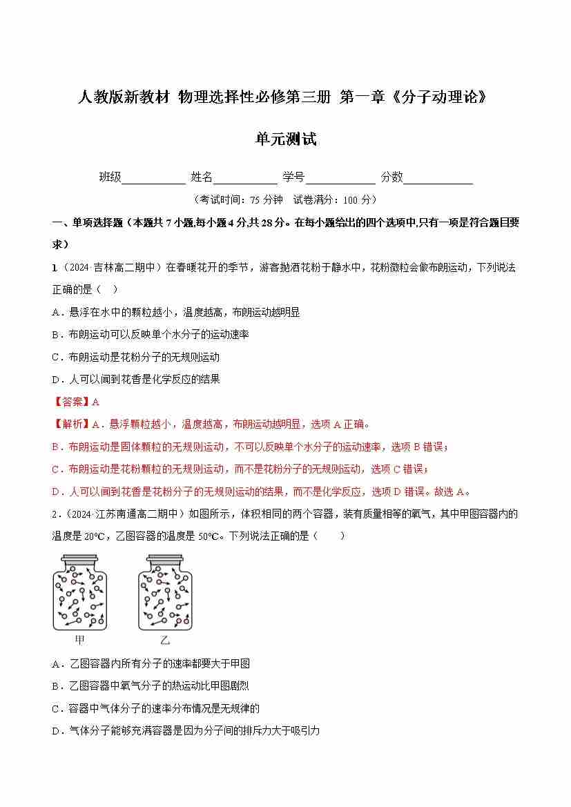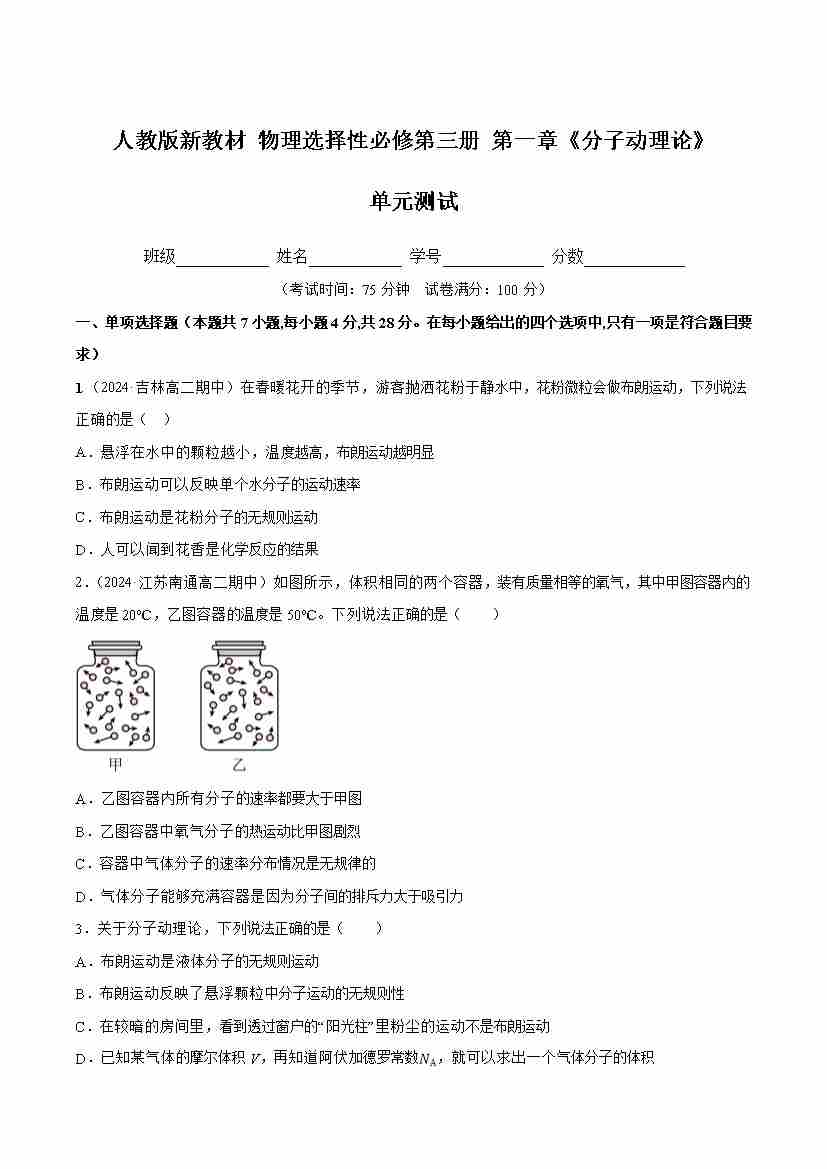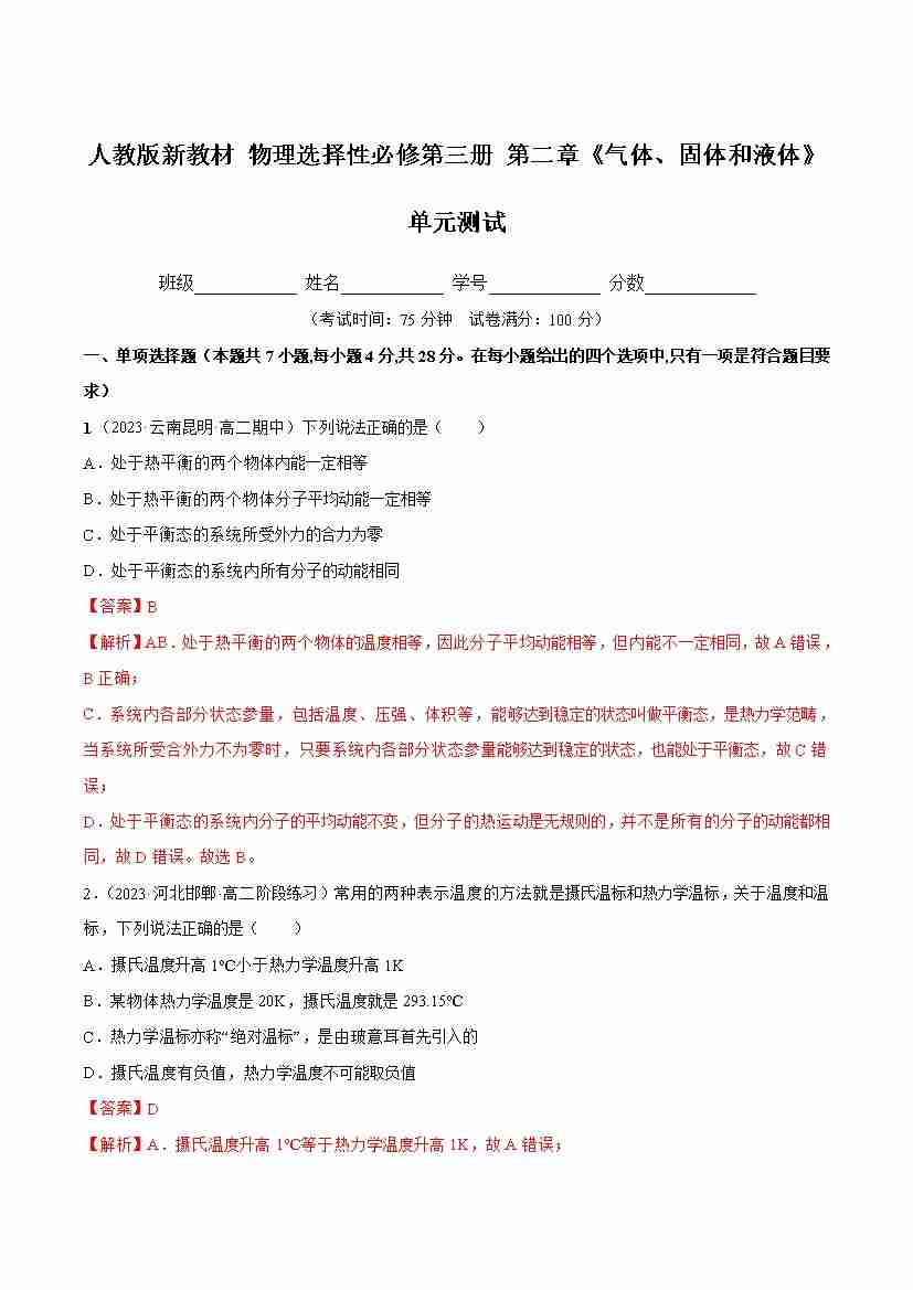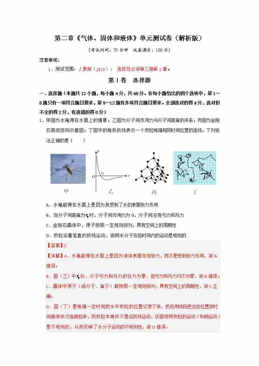 第2章《气体、固体和液体》单元测试卷(学生版)