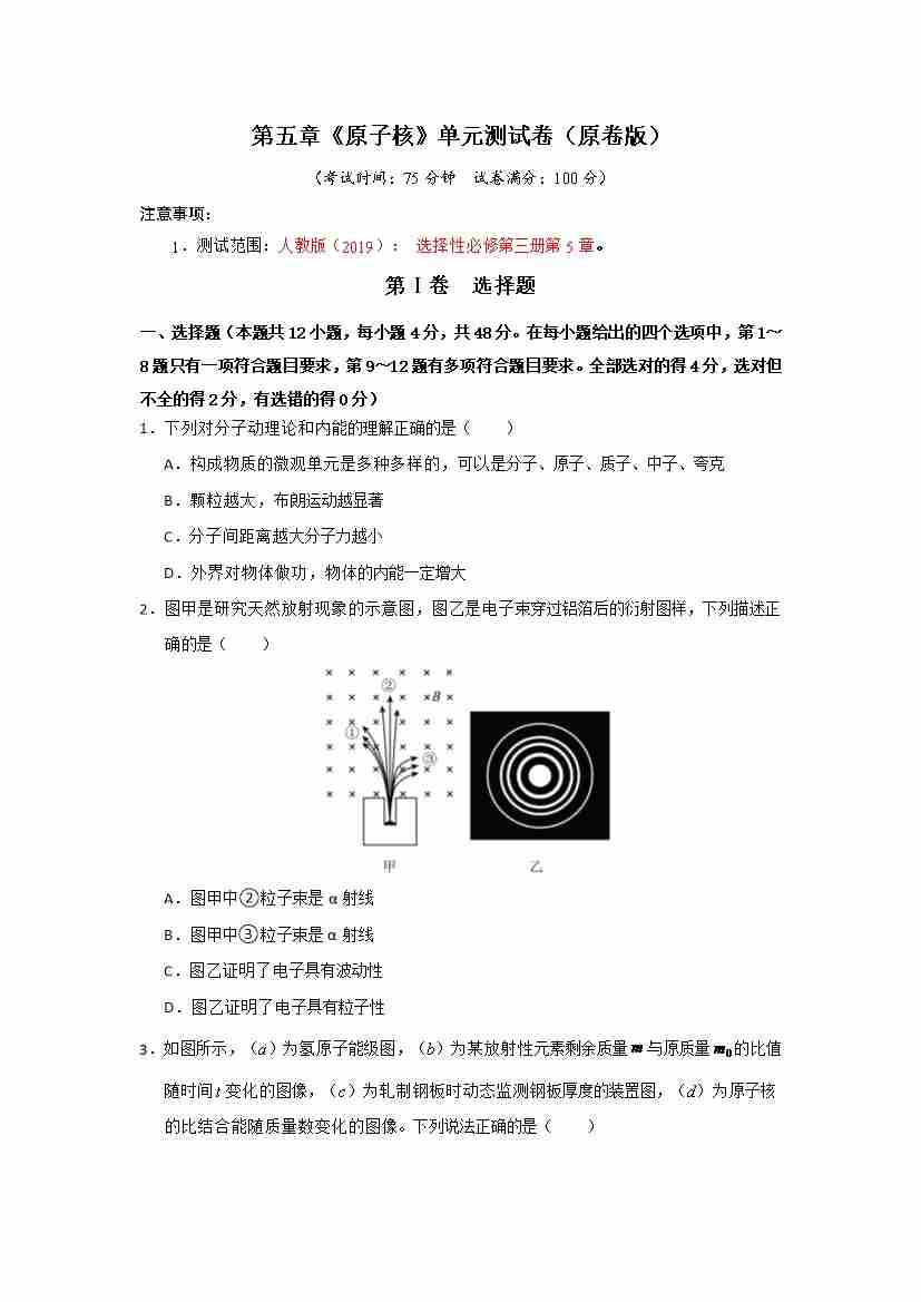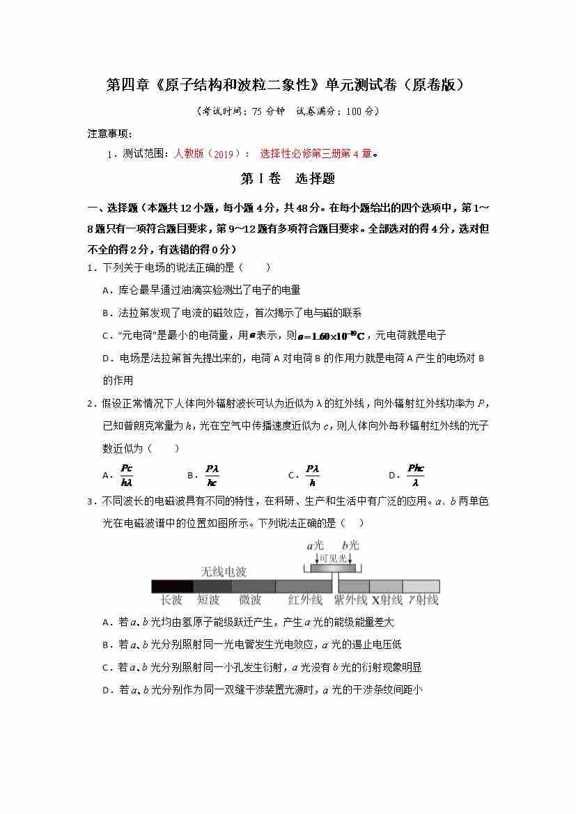 第四章 原子结构和波粒二象性(单元测试 )(原卷版)