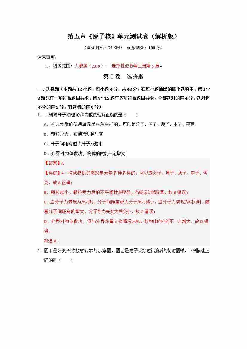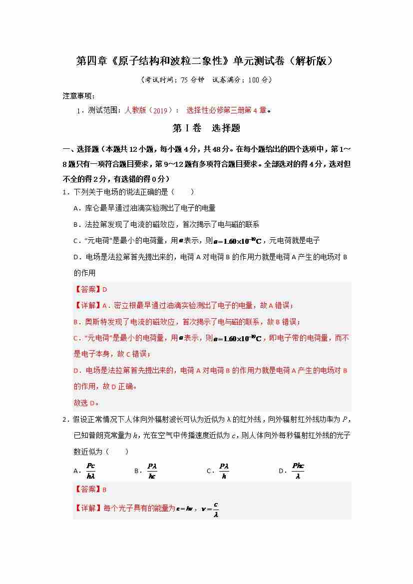 第四章 原子结构和波粒二象性(单元测试 )(解析版)