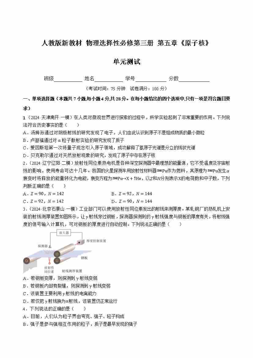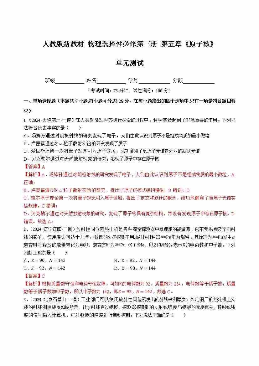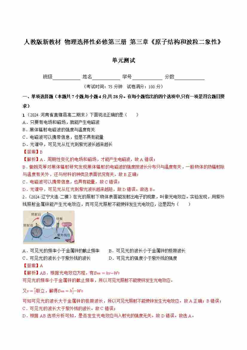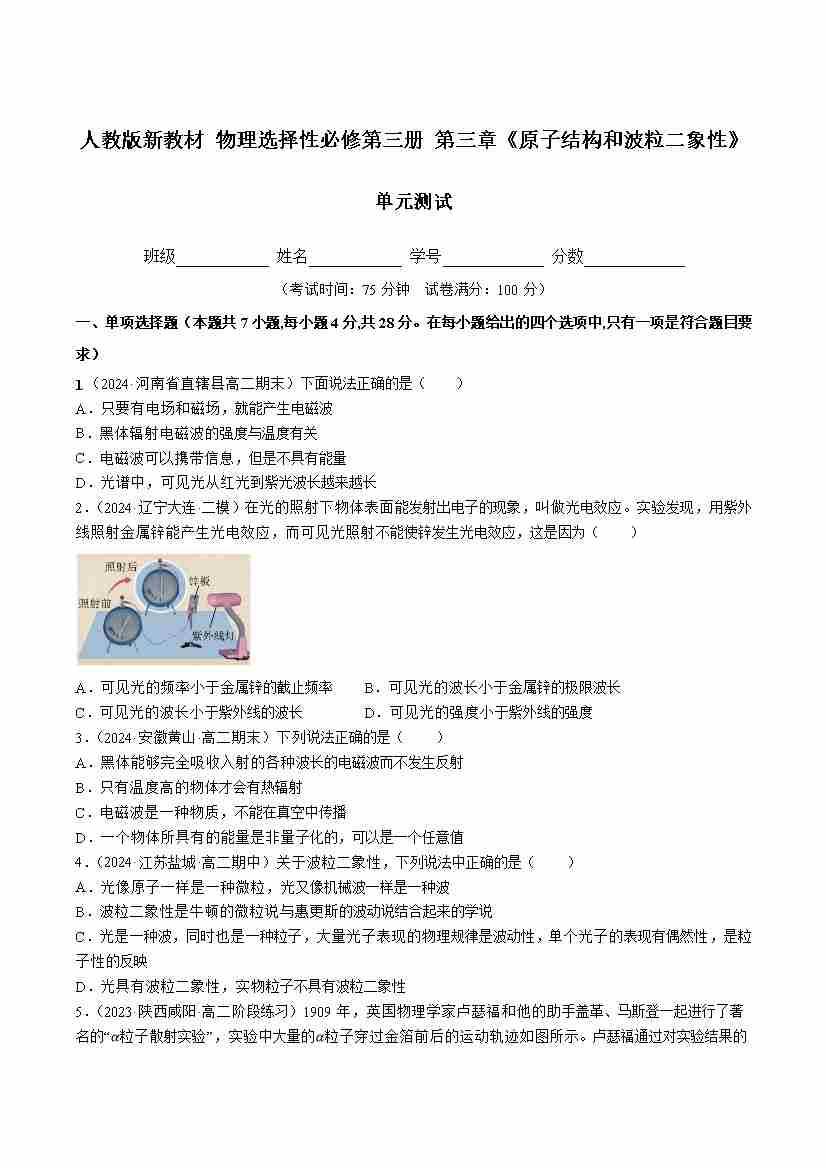 第4章《原子结构和波粒二象性》单元测试卷(学生版)