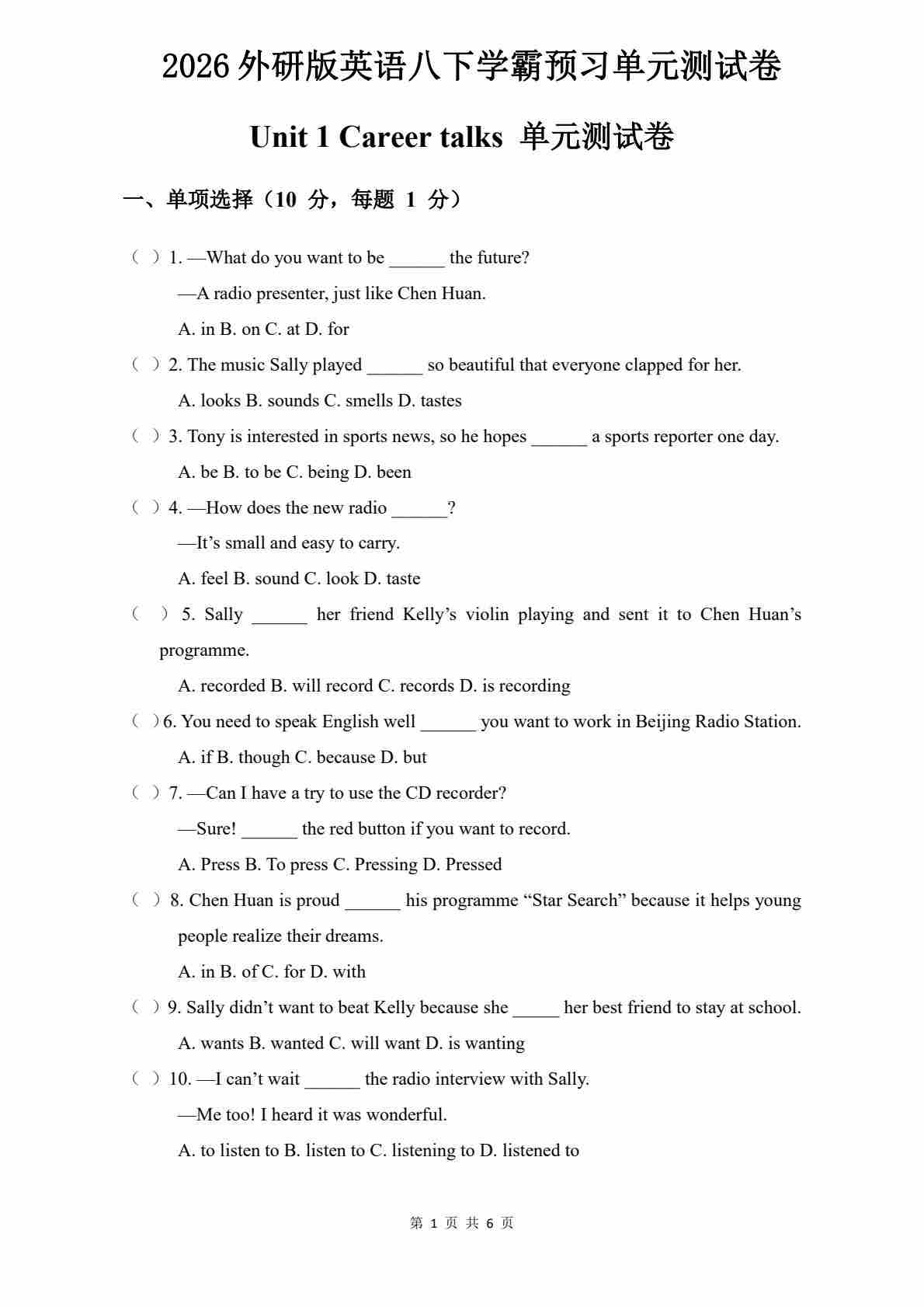 Unit 1 Career talks (单元自测·基础卷)(试题版A4)
