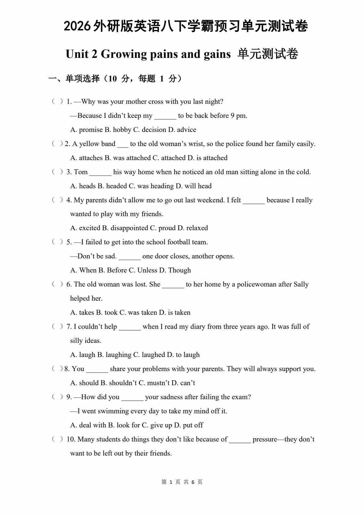 Unit 2 Growing pains and gains (单元自测·基础卷)(试题版A4)