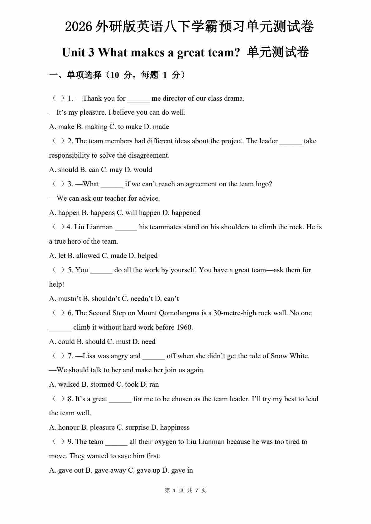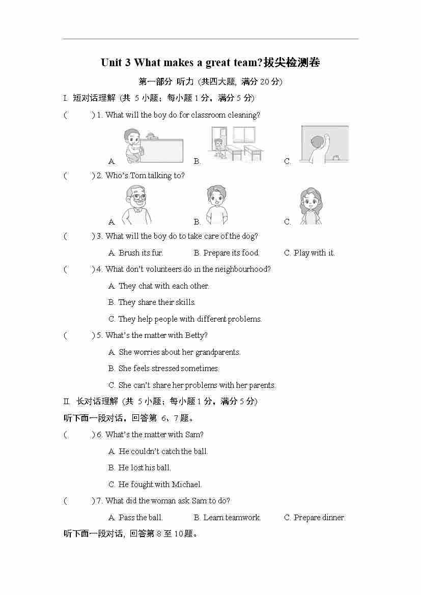 Unit 3 What makes a great team ?拔尖检测卷(含答案解析,听力原文,无听力音频)