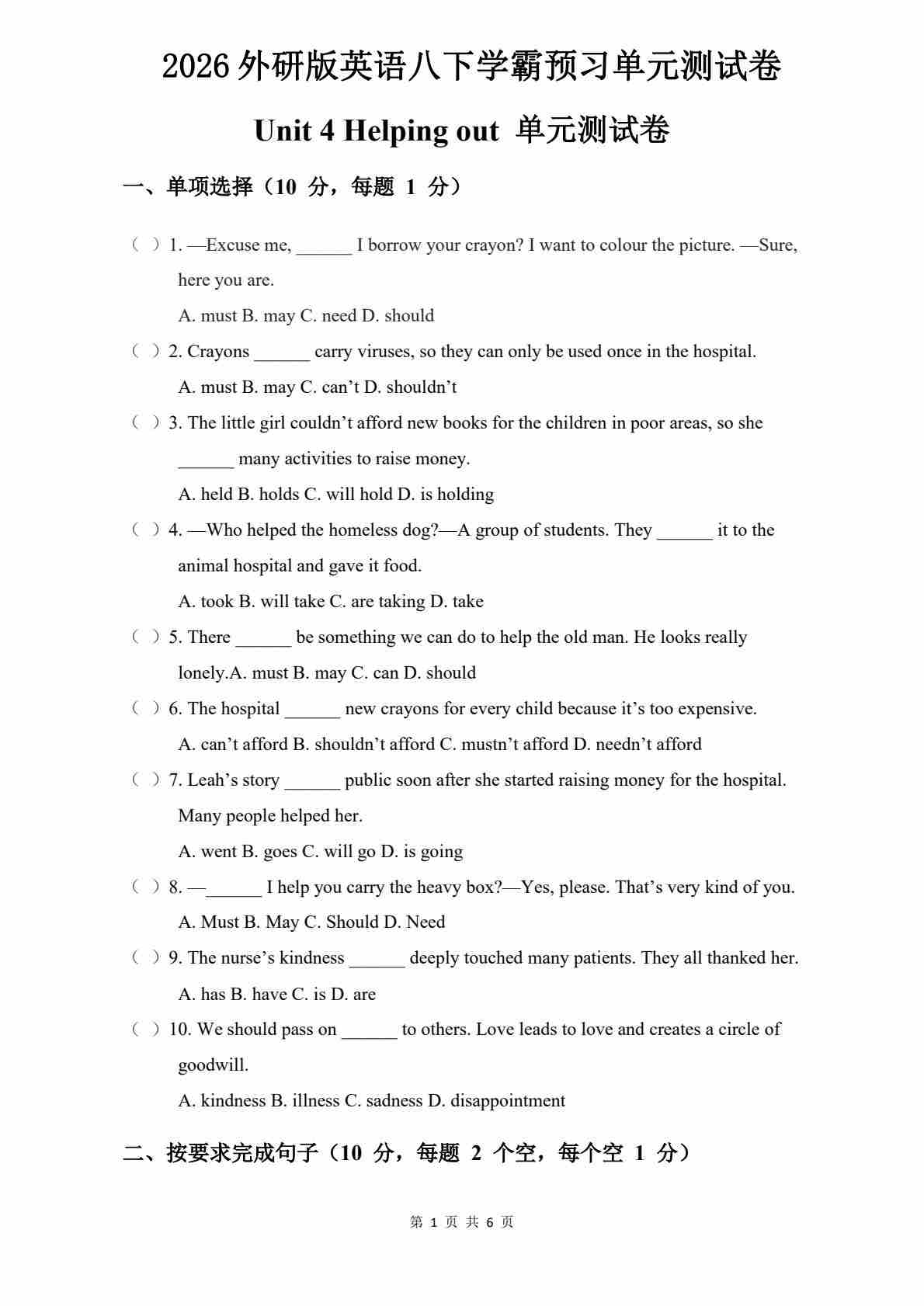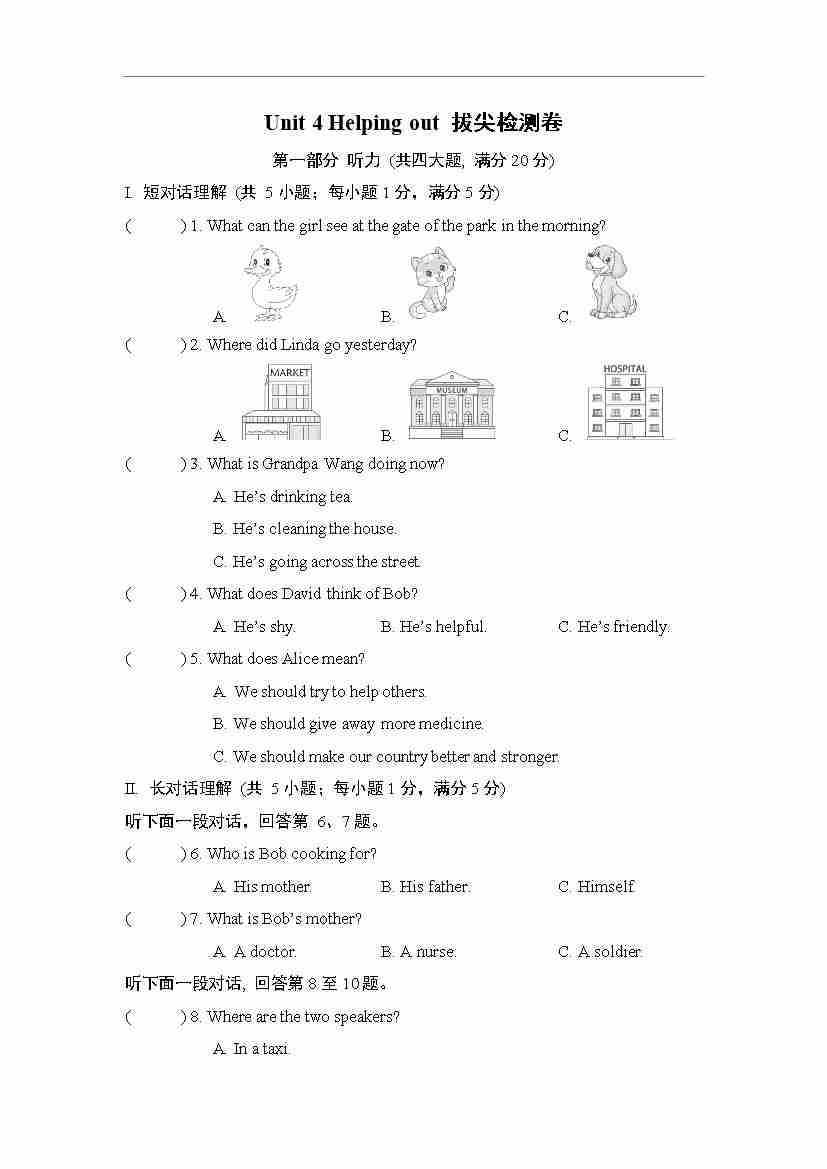 Unit 4 Helping out 拔尖检测卷(含答案解析,听力原文,无听力音频)