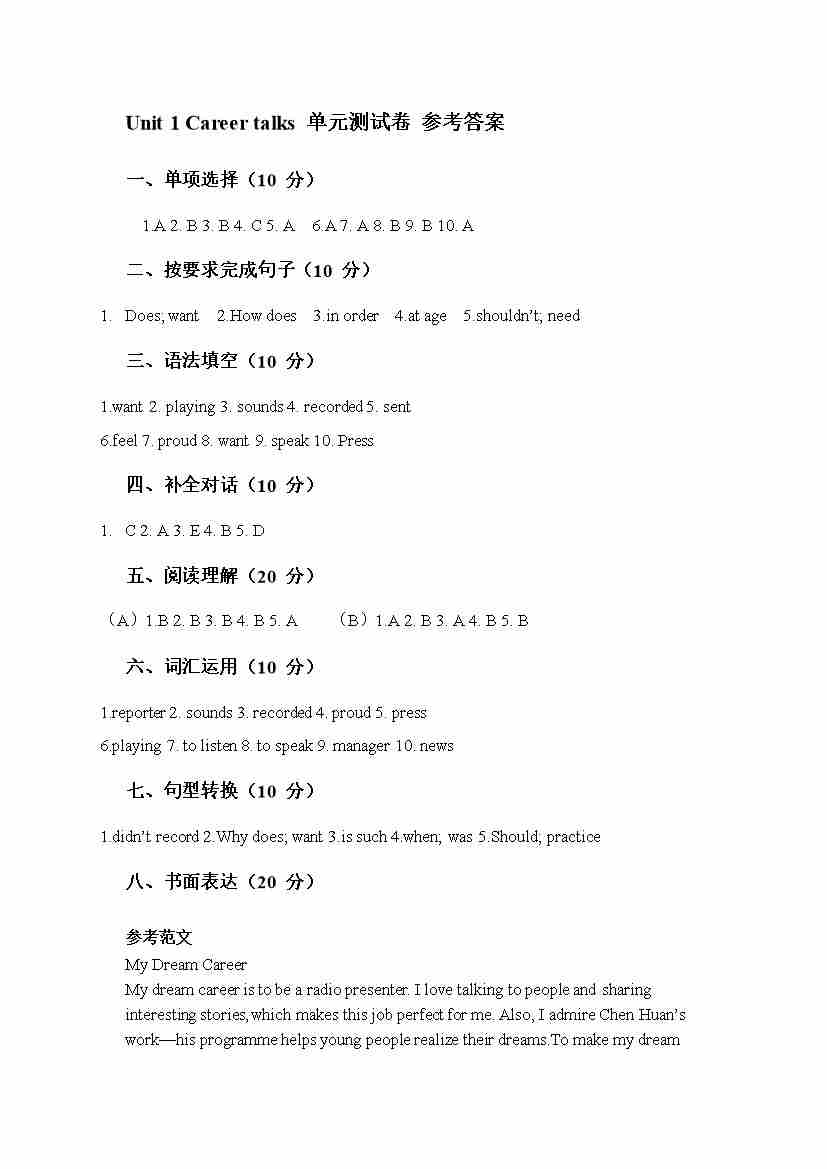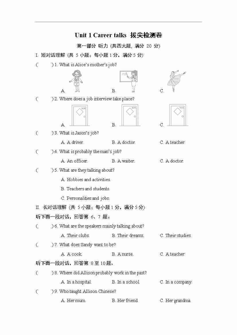 Unit 1 Career talks 拔尖检测卷(含答案解析,听力原文,无听力音频)