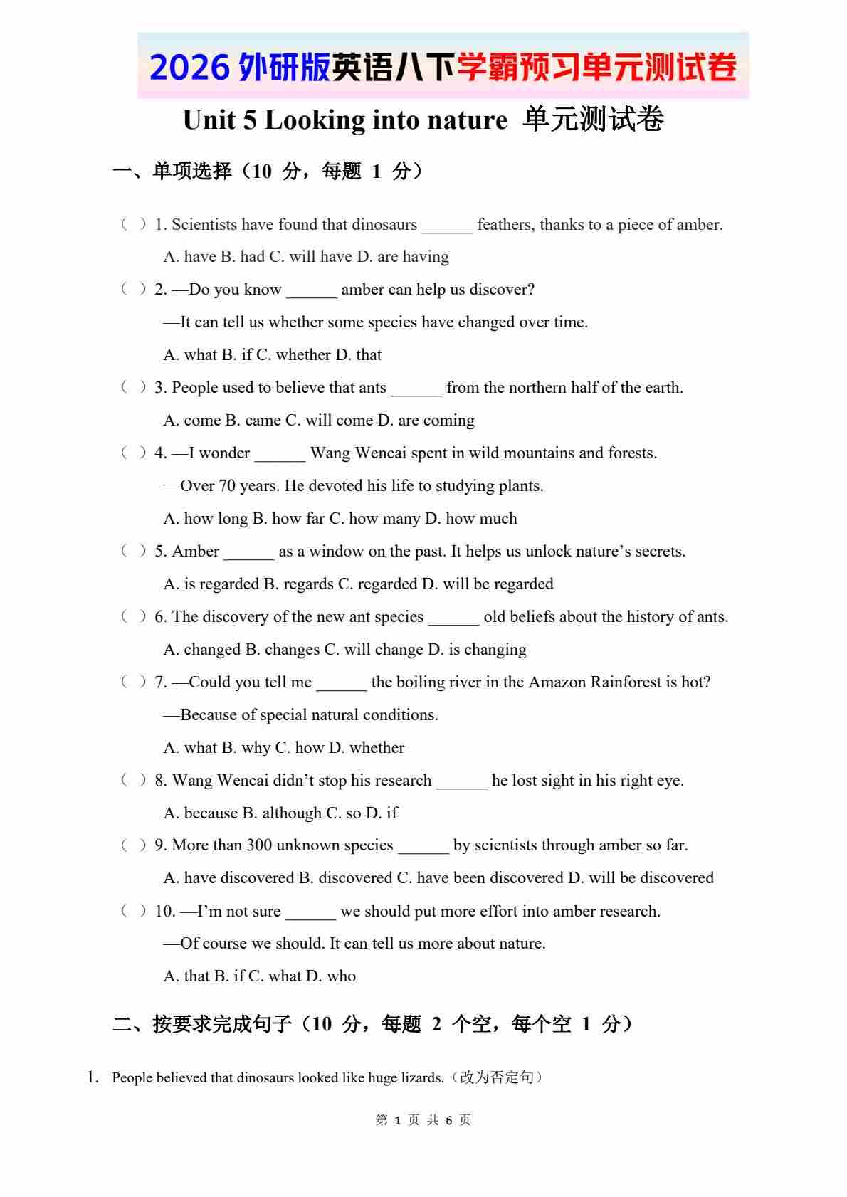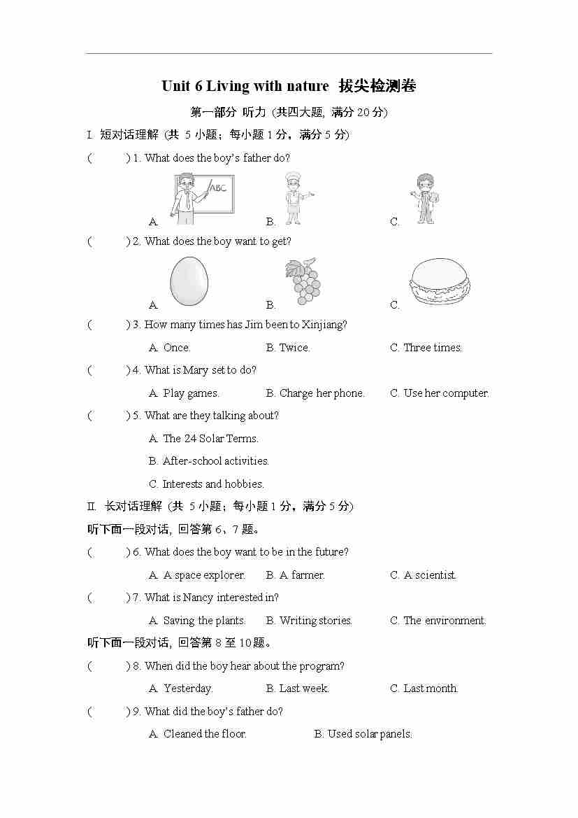 Unit 6 Living with nature 拔尖检测卷(含答案解析,听力原文,无听力音频)