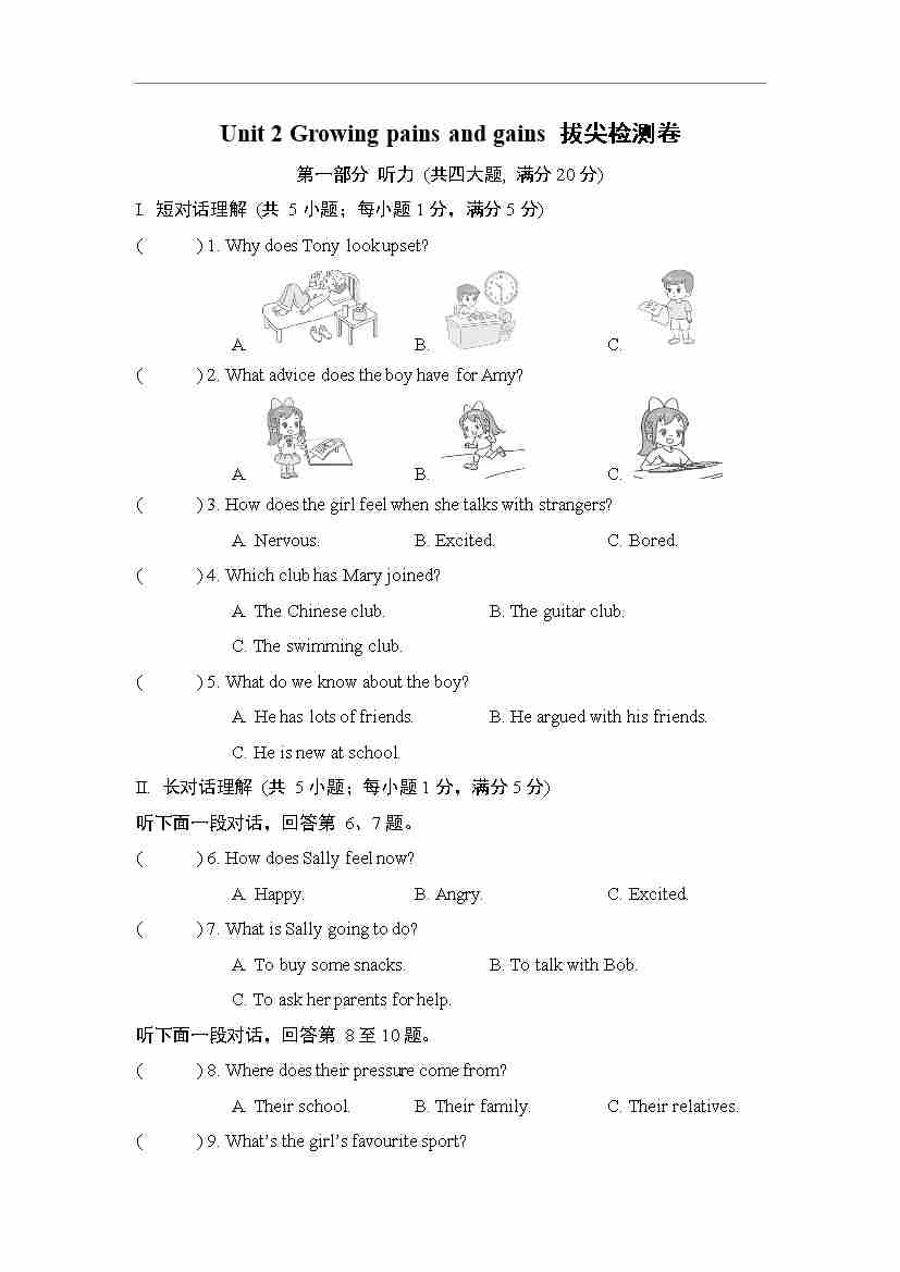 Unit 2 Growing pains and gains 拔尖检测卷(含答案解析,听力原文,无听力音频)
