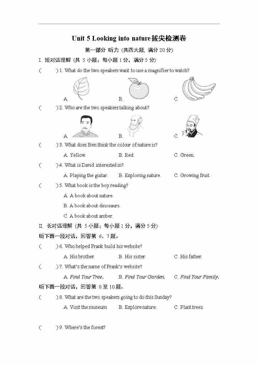 Unit 5 Looking into nature 拔尖检测卷(含答案解析,听力原文,无听力音频)