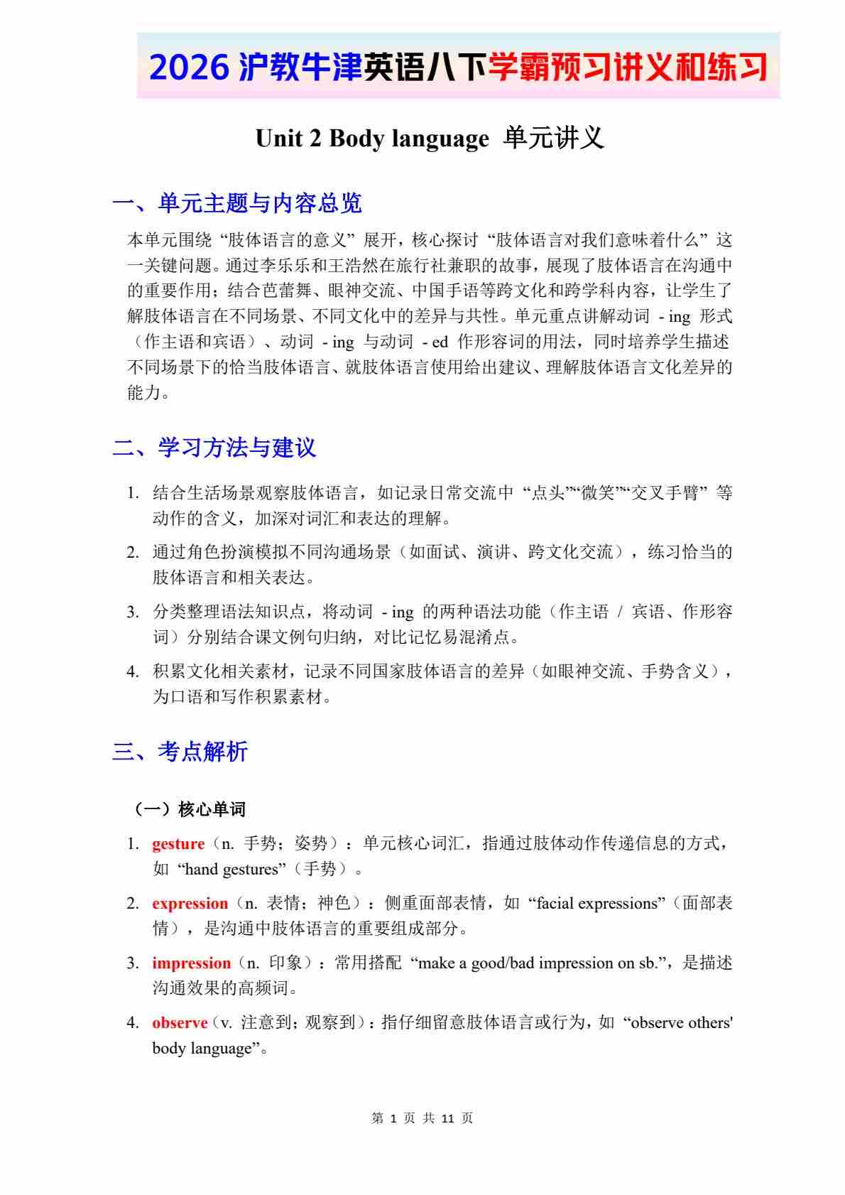Unit 2 Body Language 语法Grammar 动名词(原卷版)