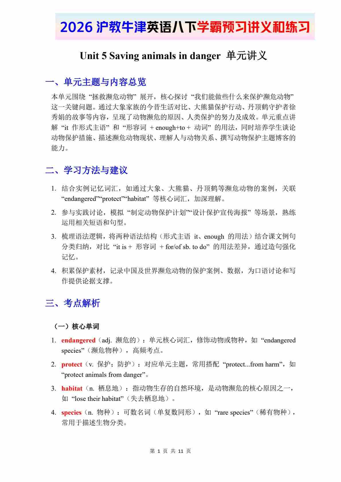 Unit 5 Saving animals in danger 语法Grammar 含有形容词的句型:it作形式主语&形容词 enoughto动词(原卷版)