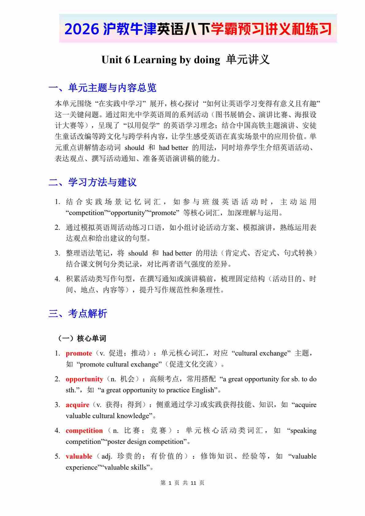 Unit 6 Learning by doing 语法Grammar 情态动词should和had better(原卷版)