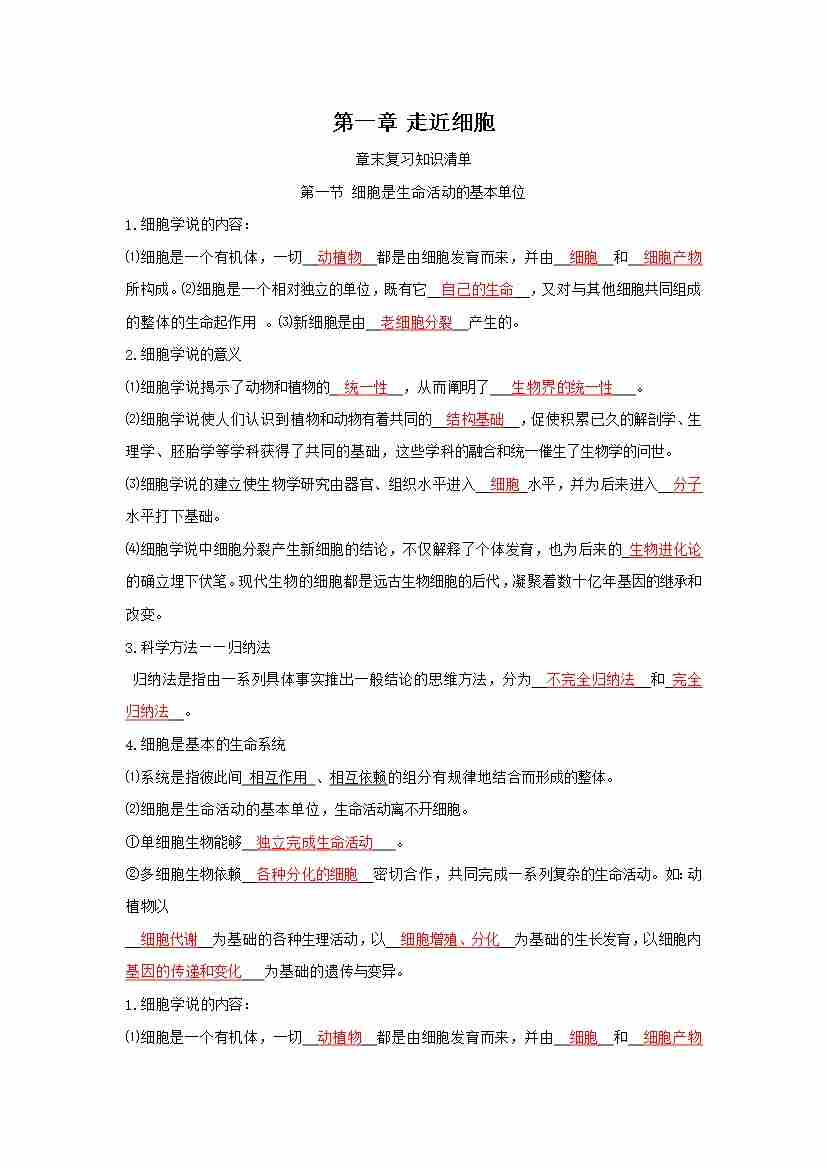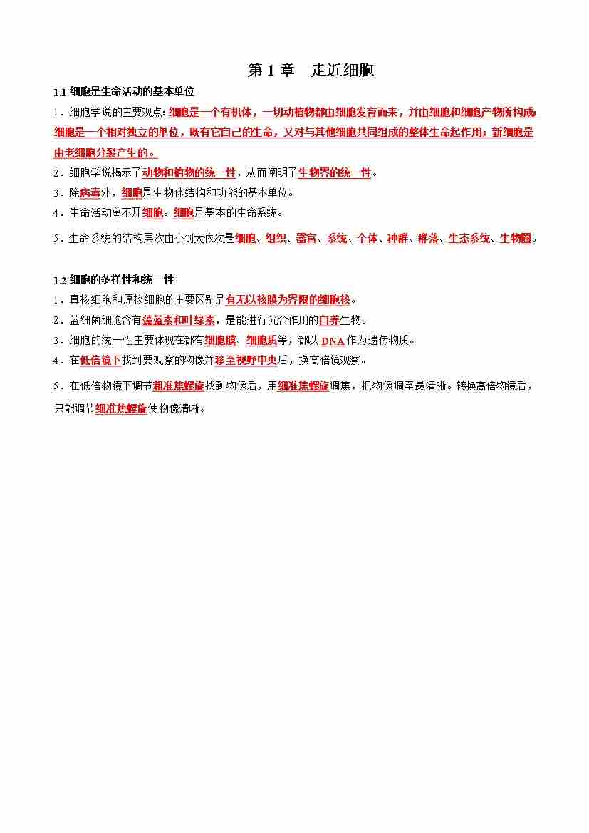 第1章 走近细胞(知识清单)(背诵版)