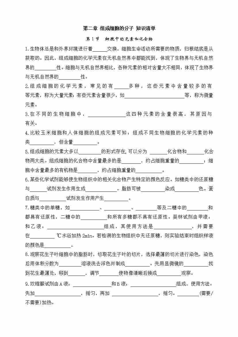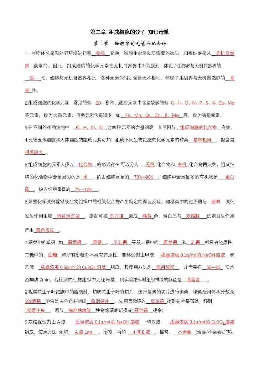 第2章 组成细胞的分子(单元知识清单)(背诵版)